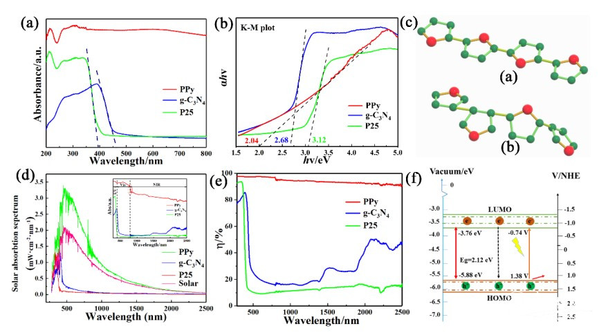 在高性能光催化材料的制備和應(yīng)用方面取得重要進展,設(shè)計了一種具有α-α高共軛結(jié)構(gòu)的有機共軛聚合物PPy光催化材料。相比傳統(tǒng)半導(dǎo)體催化劑P25和氮化碳(g-C3N4)表現(xiàn)出更強的光電、光吸收特性和更優(yōu)異的光催化性能。成果發(fā)表在國際知名期刊Applied Catalysis B:Environmental上,該研究工作我校李永博士為第一作者,我校賈曉華教授、宋浩杰和南京林業(yè)大學(xué)楊小飛教授為共同通訊作者。