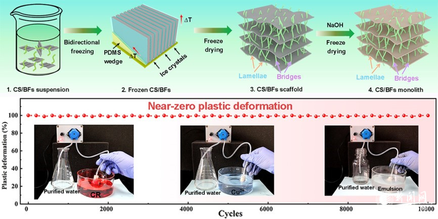 在超彈性生物質(zhì)基三維多孔材料制備及在水處理應(yīng)用方面取得了重要進展,成果發(fā)表在環(huán)境科學(xué)領(lǐng)域國際Top期刊Journal of Hazardous Materials上。該研究工作我校為論文唯一通訊單位,第一作者為楊進副教授,通訊作者為宋浩杰。