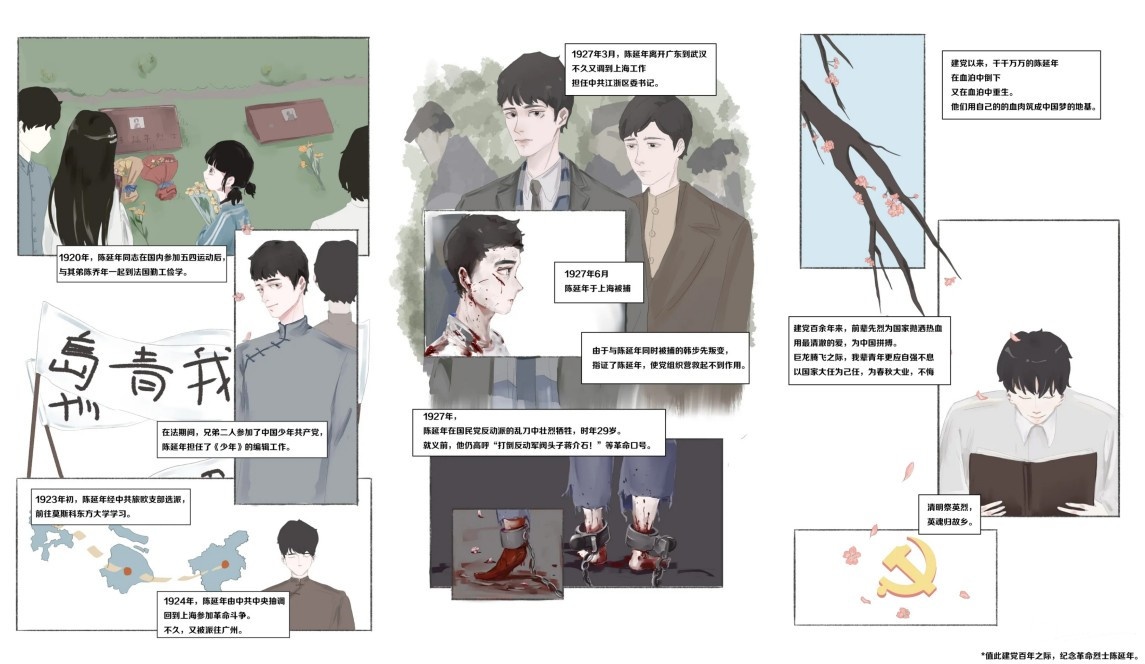 設(shè)計(jì)與藝術(shù)學(xué)院“追尋紅色記憶,傳承紅色基因”。設(shè)藝學(xué)院黨史學(xué)習(xí)教育以網(wǎng)絡(luò)文化作品創(chuàng)作為載體,依托線(xiàn)上網(wǎng)絡(luò)平臺(tái),充分發(fā)揮學(xué)科特長(zhǎng),采取條漫、微課、影評(píng)、講解、改編歌曲等豐富形式,發(fā)揮好思政工作主陣地、網(wǎng)絡(luò)空間主平臺(tái)、研學(xué)實(shí)踐大課堂的作用,引導(dǎo)廣大師生追尋紅色記憶,傳承紅色基因。從“小切口”“小故事”出發(fā),結(jié)合電視劇《覺(jué)醒年代》的熱播,學(xué)院易班工作站制作條漫《清明祭·英雄魂》,通過(guò)手繪革命先烈陳延年的英雄事跡,用圖像話(huà)語(yǔ)傳遞英雄精神。組織學(xué)生黨員、學(xué)生骨干等參觀(guān)走訪(fǎng)西安事變紀(jì)念館、大華1935博物館、梁家河、楊家?guī)X、棗園、洛川會(huì)議舊址、路遙故居、中國(guó)輕工業(yè)博物館等愛(ài)國(guó)主義教育基地,黨員同志進(jìn)行現(xiàn)場(chǎng)教學(xué)的同時(shí),“青年講師團(tuán)”現(xiàn)場(chǎng)錄制了一系列學(xué)習(xí)教育視頻并上線(xiàn)易班優(yōu)課。