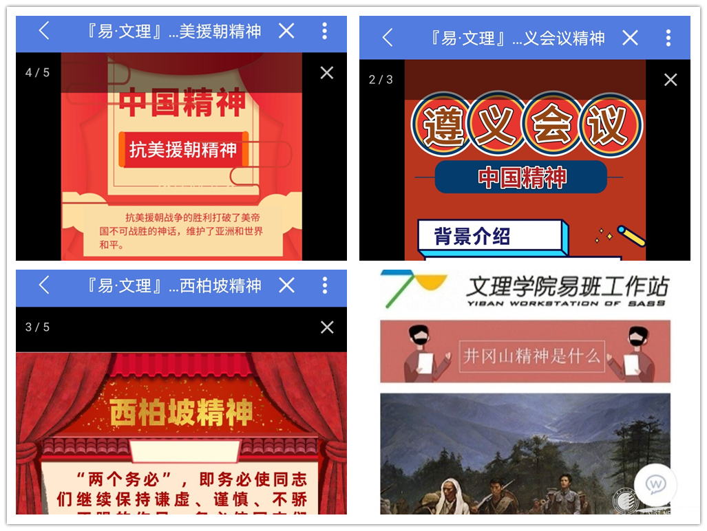 文理學(xué)院“五個(gè)一”用好網(wǎng)絡(luò)陣地,上好黨史必修課。文理學(xué)院在黨史學(xué)習(xí)教育中,統(tǒng)籌用好“網(wǎng)絡(luò)陣地”,通過(guò)建立“一知、一學(xué)、一講、一實(shí)踐、一傳承”的“五個(gè)一”工作思路,打造“紅色易班”,將網(wǎng)絡(luò)思政與黨史學(xué)習(xí)教育有機(jī)融合,推動(dòng)黨史學(xué)習(xí)教育走深走實(shí)。通過(guò)建立“百年黨史100個(gè)第一”推文專(zhuān)欄,制作H5短視頻和圖文海報(bào),以講黨史、說(shuō)故事的形式,提升大學(xué)生學(xué)習(xí)興趣和熱情。建立“學(xué)黨史,知黨情,爭(zhēng)先鋒”的易班主題快搭,通過(guò)紅色書(shū)目閱讀會(huì)、讀書(shū)交流分享會(huì)、“誰(shuí)是臥底”黨史競(jìng)猜三個(gè)部分,引導(dǎo)大學(xué)生全面介紹學(xué)習(xí)黨史相關(guān)知識(shí),將集體學(xué)習(xí)與個(gè)人學(xué)習(xí)相結(jié)合,將理論學(xué)習(xí)與思想交流相融合,將深邃內(nèi)涵與趣味載體相統(tǒng)一,極大豐富了青年學(xué)習(xí)黨史的載體與形式,有效提升黨史學(xué)習(xí)教育的感染性和實(shí)效性。