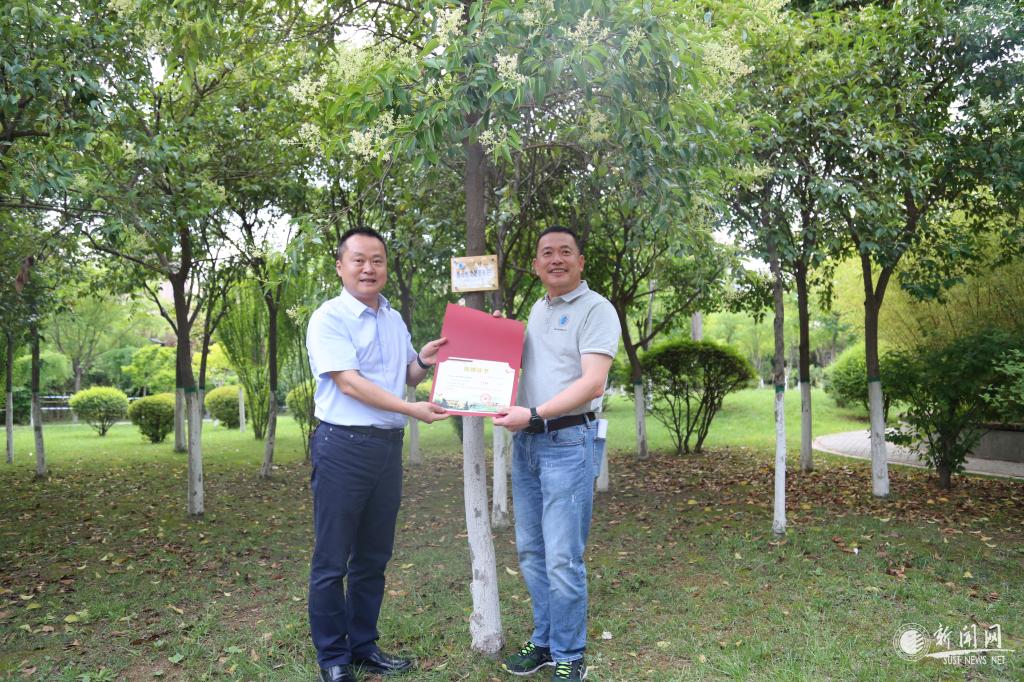 研86級校友們長期以來關(guān)心、支持學校建設與發(fā)展,在校慶期間捐贈了銅雕紀念品,現(xiàn)擺放在輕工學院樓內(nèi)。這次返校,研86級校友還給母校贈送了紀念品,并來到校友林舉行樹木認捐掛牌儀式,由校友代表陳訊武為認領(lǐng)樹木掛樹牌,由李學軍為陳訊武頒發(fā)捐贈證書。