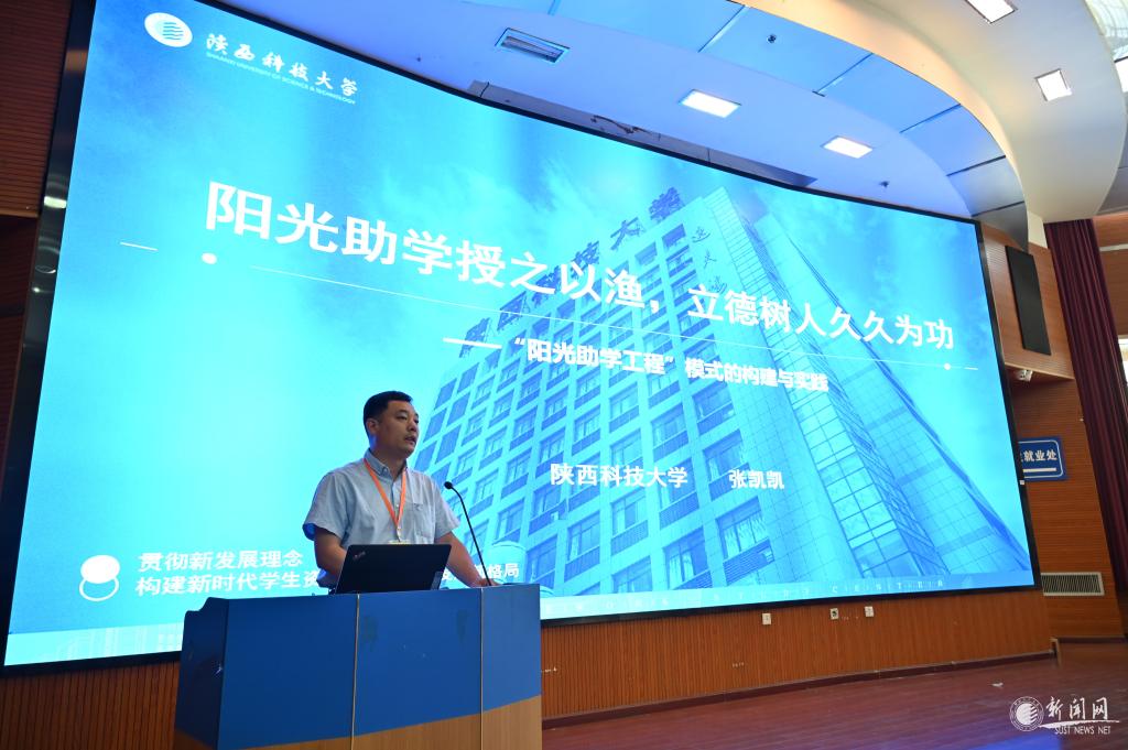 張凱凱以《陽光助學(xué)授之以漁立德樹人久久為功——陜西科技大學(xué)陽光助學(xué)工程的構(gòu)建與實(shí)踐》為題,進(jìn)行發(fā)言。他圍繞學(xué)?!瓣柟庵鷮W(xué)工程”資助育人體系的構(gòu)建與實(shí)踐探索,詳細(xì)介紹了我校將“人才培養(yǎng)模式改革”“創(chuàng)業(yè)實(shí)踐基地建設(shè)”“捐助扶持制度建設(shè)”“精神資助體系構(gòu)建”作為突破口,推出能力提升計(jì)劃,建設(shè)六大經(jīng)濟(jì)實(shí)體,設(shè)立三大助學(xué)基金,構(gòu)建一體化陽光精神資助體系的工作模式。