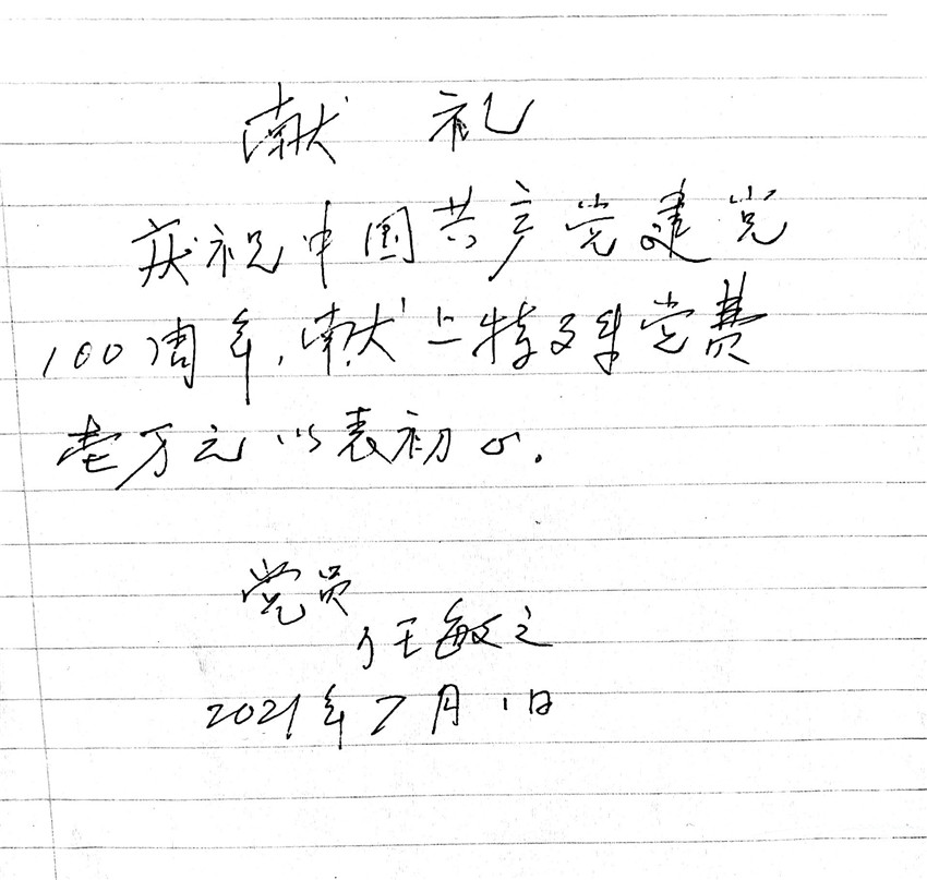 任敏之還隨“特殊黨費(fèi)”向組織上交了一封親筆信,信中寫道,“慶祝中國共產(chǎn)黨成立100周年,獻(xiàn)上特殊黨費(fèi)壹萬元以表初心?!?/p>