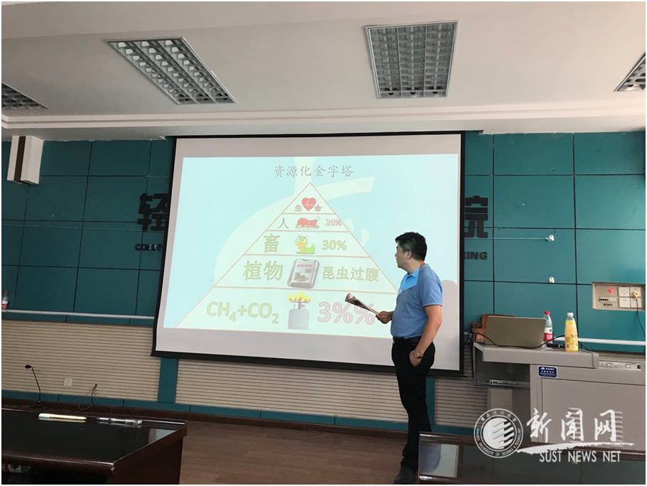 戚愷就國(guó)內(nèi)外有機(jī)濕垃圾處理與資源化再利用的前沿技術(shù)與未來(lái)行業(yè)發(fā)展方向做了全面介紹,重點(diǎn)探討了黑水虻生物降解餐廚垃圾,實(shí)踐碳中和綠色發(fā)展的新工藝和新途徑,詳細(xì)講解了有別于傳統(tǒng)濕垃圾預(yù)處理系統(tǒng)的“水洗分揀”自主創(chuàng)新工藝,以及智能化“料動(dòng)蟲(chóng)不動(dòng)”黑水虻規(guī)模養(yǎng)殖新理念。另外,戚愷結(jié)合個(gè)人從業(yè)經(jīng)歷以及愷利爾公司的發(fā)展歷程,以詼諧輕松的語(yǔ)言分享了環(huán)保從業(yè)者創(chuàng)新創(chuàng)業(yè)的心里歷程,啟發(fā)了學(xué)生的自主創(chuàng)新意識(shí),同時(shí)引導(dǎo)學(xué)生對(duì)專(zhuān)業(yè)責(zé)任感和使命感進(jìn)行深度思考。