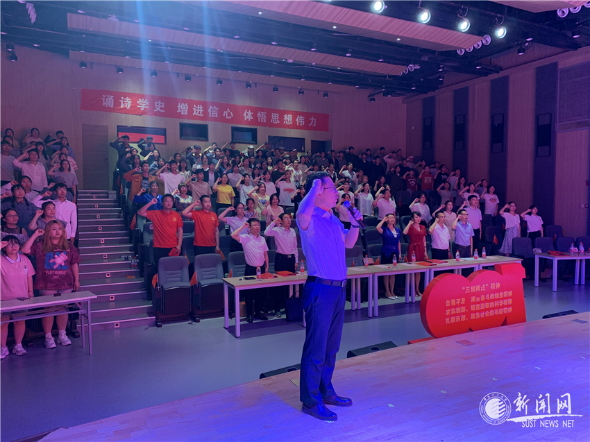 學(xué)院黨委書(shū)記訾榮祿代表黨委班子成員品讀《沁園春·長(zhǎng)沙》,充分解讀毛澤東主席創(chuàng)作該詩(shī)詞的歷史背景,深情回顧建黨初期的崢嶸歲月,深刻闡釋習(xí)近平總書(shū)記引用該詞賦予的新時(shí)代精神內(nèi)涵,鼓勵(lì)全體黨員同志愛(ài)黨愛(ài)國(guó)、胸懷大志、珍惜當(dāng)下、奮發(fā)有為,并帶領(lǐng)全體黨委班子成員進(jìn)行了朗誦,重溫一代偉人的遠(yuǎn)大志向和浩然壯氣。展演最后,訾榮祿帶領(lǐng)學(xué)院黨委委員和全體到場(chǎng)同志重溫了入黨誓詞。