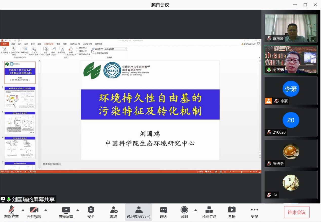劉國瑞研究員以“環(huán)境持久性自由基的污染特征及轉化機制”為題,首先介紹了關于環(huán)境持久性自由基的研究和發(fā)展史,隨后從二噁英的研究發(fā)現(xiàn)環(huán)境持久性自由基的存在引出對持久性自由基的研究。劉國瑞研究員重點介紹了實驗室由過渡金屬參與產生環(huán)境持久性自由基的機制,不同過渡金屬種類和濃度對自由基濃度的影響?;谝陨戏治?,回答了環(huán)境持久性自由基存在的潛在健康效應,展望了環(huán)境持久性自由基的研究方向。
