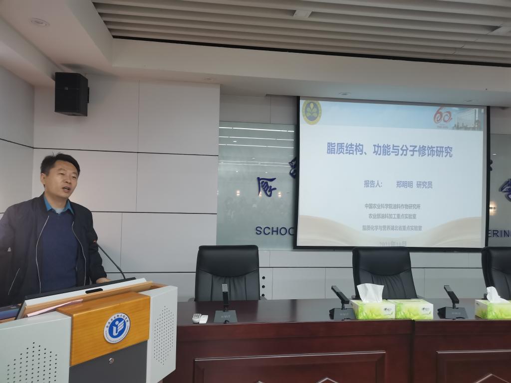 10月13日上午,中國農(nóng)業(yè)科學院油料作物研究所鄭明明研究員應(yīng)邀做客我校,作了題為“脂質(zhì)結(jié)構(gòu)、功能與分子修飾研究”的學術(shù)報告,食品與生物工程學院教師和研究生代表參加了本次報告會。報告會由食品學院副院長李國梁教授主持。