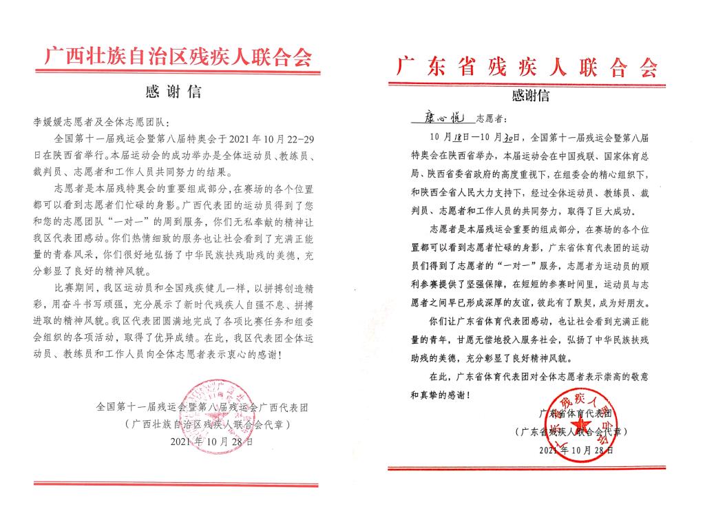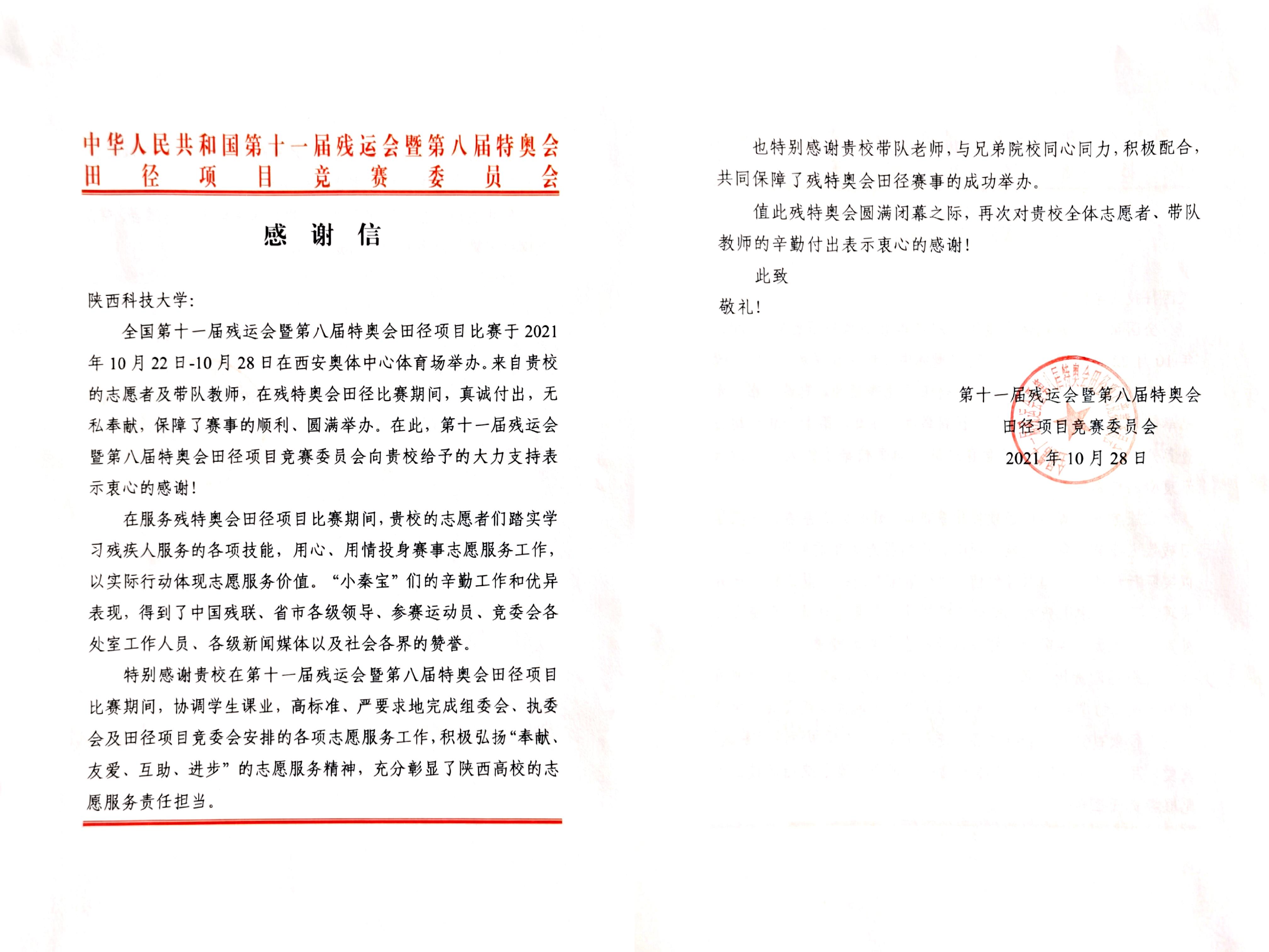 本次殘?zhí)貖W會志愿服務工作,陜西科技大學218名志愿者和5位帶隊教師積極投身志愿服務工作,全力以赴、奮勇向前,時刻秉承“三創(chuàng)兩遷”的大學精神,將“至誠至博”校訓融入志愿服務工作中,為殘?zhí)貖W會提供了有溫度、高質(zhì)量、專業(yè)化的服務。他們用心、用情、用行動詮釋著“奉獻、友愛、互助、進步”的志愿服務精神。星星點點的服務匯聚成海,鑄就了此次殘?zhí)貖W會田徑賽事的圓滿舉辦?!包c亮夢想,為愛起航”,科大小秦寶不負眾望,榮耀而歸。