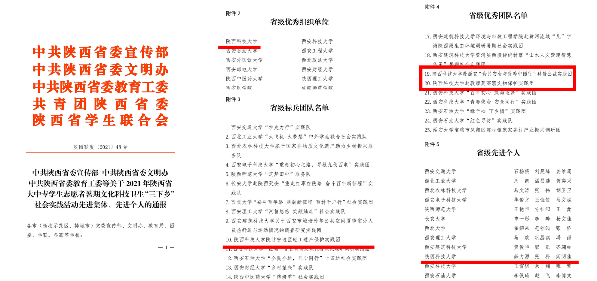 近日,在由陜西省委宣傳部、省委教育工委、省文明辦、團(tuán)省委、省學(xué)聯(lián)組織的2021年陜西省大中專學(xué)生志愿者暑期文化科技衛(wèi)生“三下鄉(xiāng)”社會實踐活動評優(yōu)中,我校榮獲“省級優(yōu)秀組織單位”稱號;“陜甘寧邊區(qū)輕工遺址保護(hù)實踐團(tuán)”被評為省級標(biāo)兵團(tuán)隊,“赴西安‘食品安全與營養(yǎng)中國行’科普公益實踐團(tuán)”“赴敦煌莫高窟文物保護(hù)實踐團(tuán)”被評為省級優(yōu)秀團(tuán)隊,《信息化背景下的紅色博物館講解服務(wù)探究》榮獲“省級優(yōu)秀調(diào)研報告”,中國輕工業(yè)博物館薛力源、材料科學(xué)與工程學(xué)院張科、食品與生物工程學(xué)院閆明佳榮獲“先進(jìn)個人”榮譽稱號。