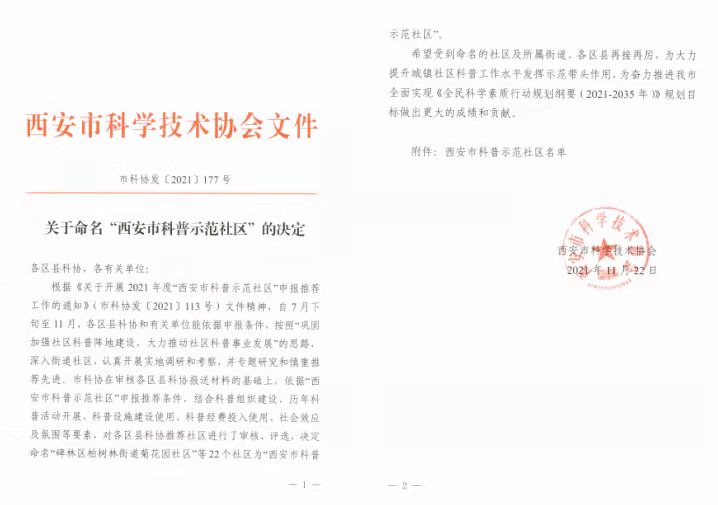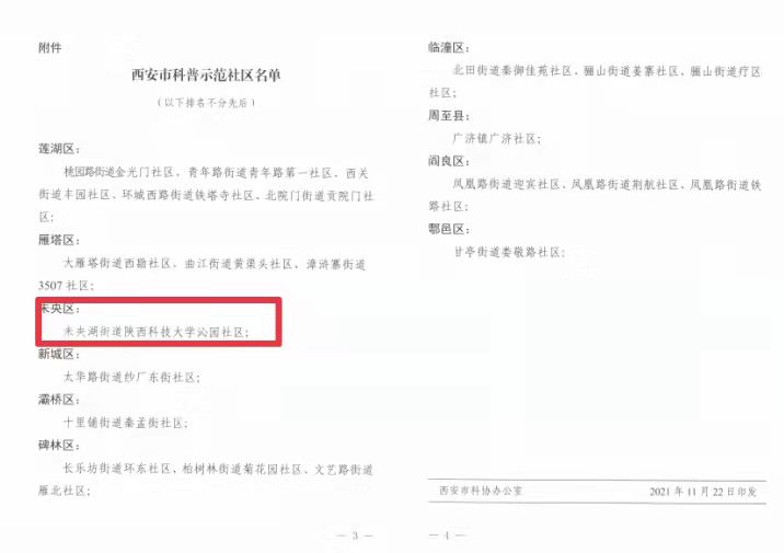 11月22日,西安市科學(xué)技術(shù)協(xié)會(huì)發(fā)布《關(guān)于命名“西安市科普示范社區(qū)”的決定》(市科協(xié)發(fā)〔2021〕177號(hào))文件,將西安市共22個(gè)社區(qū)命名為“西安市科普示范社區(qū)”。陜西科技大學(xué)沁園社區(qū)通過(guò)層層審核、評(píng)選,成為未央?yún)^(qū)唯一一個(gè)獲此命名的社區(qū)。