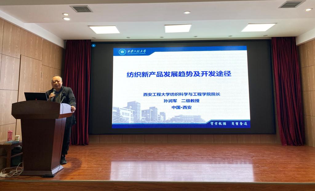 11月30日上午,應我??萍继帯⑶把卦杭拜p工科學與工程學院邀請,西安工程大學孫潤軍教授做客我校“前沿學術報告”,作了題為“紡織新產品發(fā)展趨勢及開發(fā)途徑”的學術報告。報告會由輕工學院鮑艷教授主持,學院相關專業(yè)教師、研究生聆聽了此次報告會。