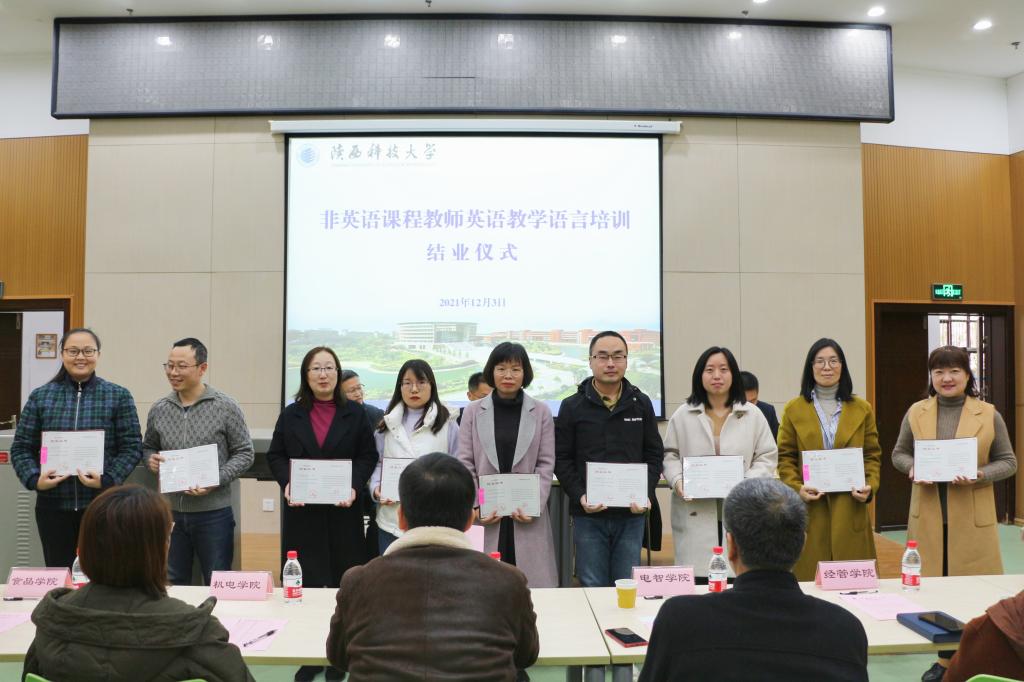 12月3日下午,我校非英語(yǔ)課程教師英語(yǔ)教學(xué)語(yǔ)言培訓(xùn)結(jié)業(yè)儀式在教師發(fā)展中心培訓(xùn)教室舉行。阿爾斯特學(xué)院黨支部副書記、副院長(zhǎng)薛朝華,西安外國(guó)語(yǔ)大學(xué)教育部出國(guó)留學(xué)人員培訓(xùn)部主任李村璞、西安外國(guó)語(yǔ)大學(xué)教育部出國(guó)留學(xué)人員培訓(xùn)部培訓(xùn)項(xiàng)目總負(fù)責(zé)人肖立志、各學(xué)院教學(xué)副院長(zhǎng)及相關(guān)人員出席。