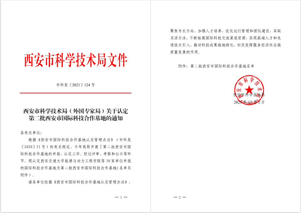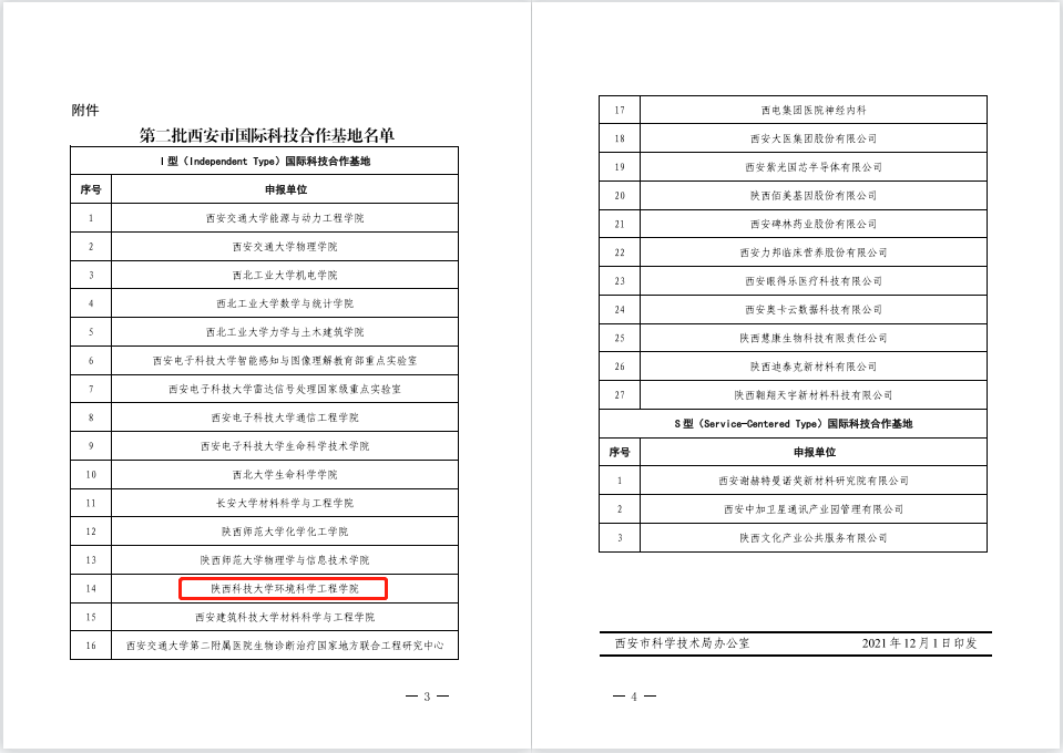 近日,西安市科技局下發(fā)了《關(guān)于認(rèn)定第二批西安市國際科技合作基地的通知》(市科辦發(fā)〔2021〕124號),共認(rèn)定西安市國際科技合作基地30家。其中,我校環(huán)境科學(xué)與工程學(xué)院王傳義教授團隊申報的“生態(tài)環(huán)境材料與綠色低碳技術(shù)國際科技合作基地”成功獲批為西安市國際科技合作基地。至此,我校共獲批西安市國際科技合作基地2個。
