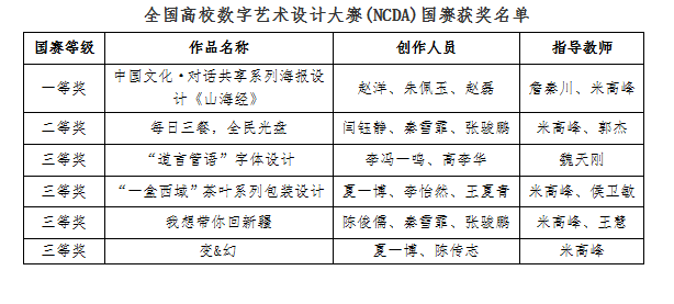 近日,第九屆全國高校數(shù)字藝術(shù)設(shè)計大賽(NCDA)落下帷幕,我校斬獲國家級獎項6項,其中一等獎1項、二等獎1項、三等獎4項;獲省賽一等獎13項、二等獎17項、三等獎16項。
