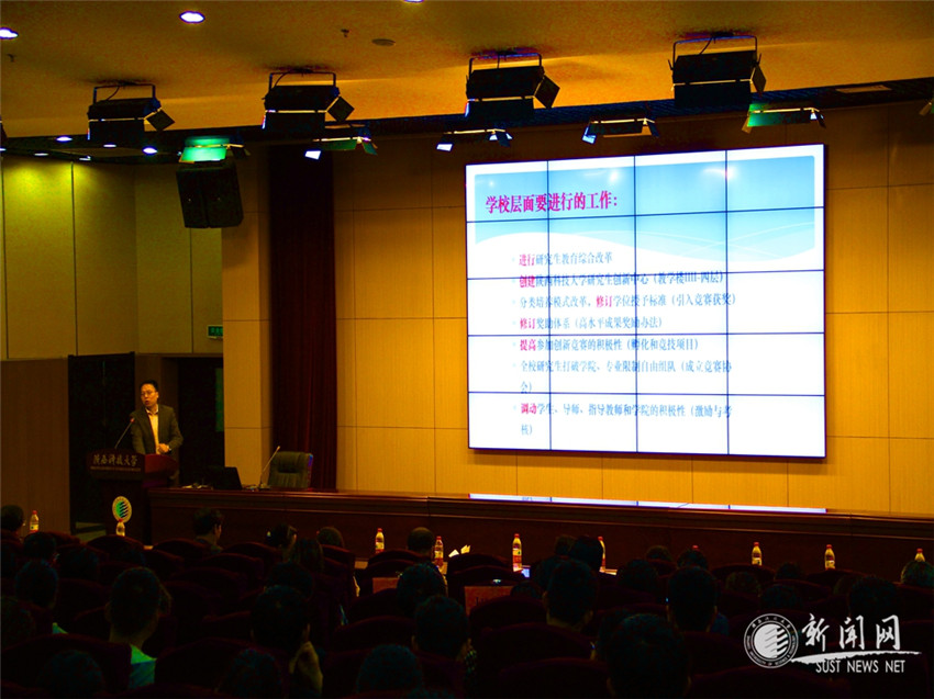 蒲永平以“打造創(chuàng)新實踐平臺,提升研究生培養(yǎng)質量”為主題,介紹了全國研究生創(chuàng)新實踐系列大賽的背景和賽事變化,分析了我校近年來參加國家級賽事的成績和不足,并對今后如何提高研究生創(chuàng)新實踐能力的措施和工作做了介紹。蒲永平在報告中指出,今年是我校研究生教育綜合改革措施實施的關鍵性年份。學校針對我校研究生創(chuàng)新創(chuàng)業(yè)教育,先后建立了5個研究生創(chuàng)新實踐協(xié)會和1個研究生創(chuàng)新實踐中心。今后將分門別類地對研究生進行培養(yǎng),將研究生的學科競賽成績引入學位授予標準和研究生獎助體系,在全校范圍內打破學院、專業(yè)限制。針對研究生申請創(chuàng)新實踐項目,學校提倡跨學院跨學科自由組隊,以此來調動學生、導師、指導教師和學院四方的積極性。