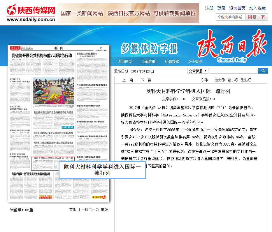 陜西日報3月27日在“要聞”版以《陜科大材料科學學科進入國際一流行列》為題,報道了我校材料科學學科首次進入ESI全球排名前1%的新聞,全文轉(zhuǎn)載如下: