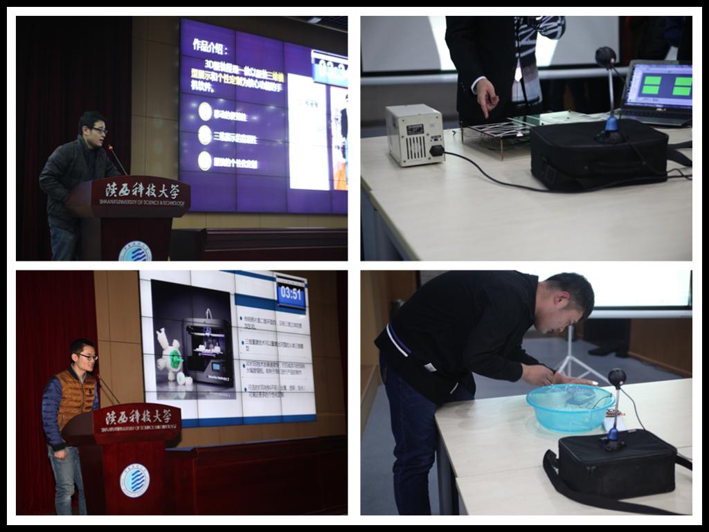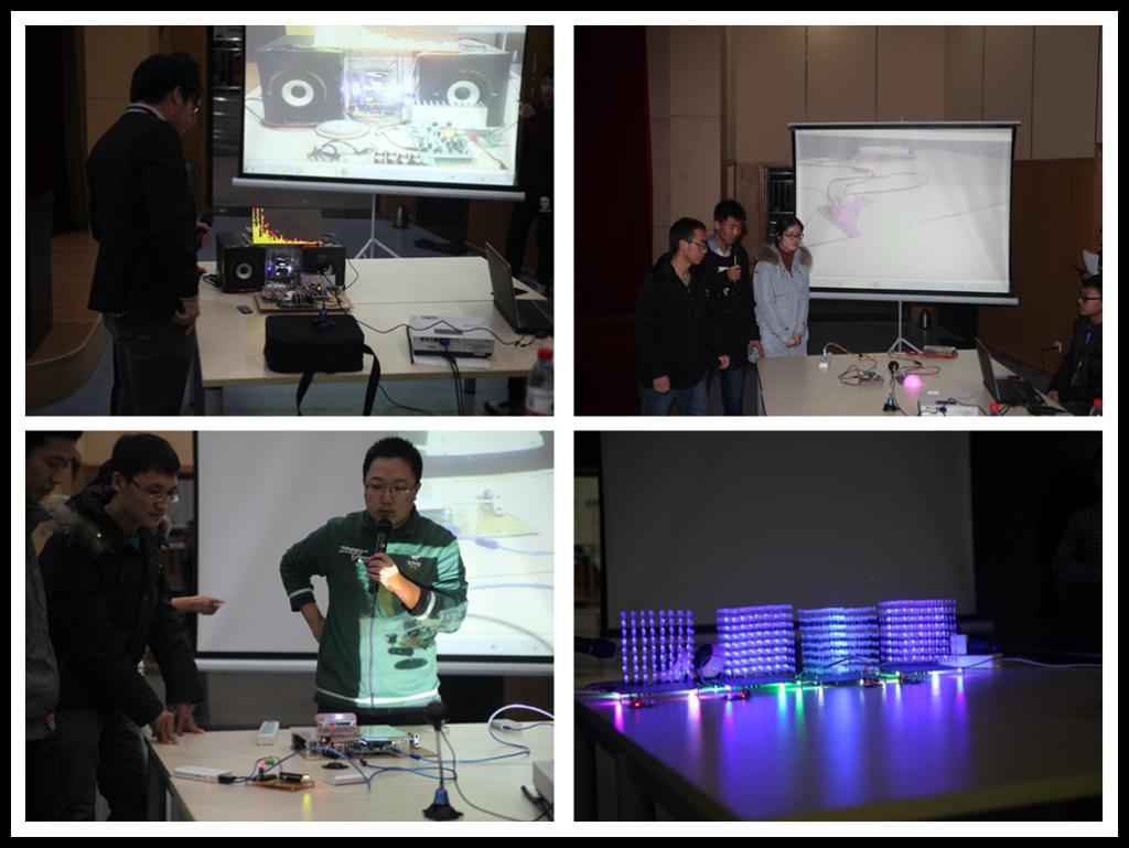 決賽當晚亮點不斷,創(chuàng)意無限。8支入圍團隊依次上臺進行作品展示和公開答辯?!痘贏RM的雙通道立體聲人機交互式音樂播放器》利用“互聯(lián)網(wǎng)+”技術控制3維立體圖案和音樂的播放,充分活躍了現(xiàn)場的氣氛;《PWM配光燈》為一款家用調色配光燈,以新穎的顏色帶給大家浪漫的享受;《光學測距儀》利用超聲波定距追蹤小車,速度與功能的完美融和讓人贊不絕口;《聯(lián)動心房》獨特的造型設計和酷炫的LED效果讓全場人員心跳加速;《3D服裝屋》各色的精美服裝只為您量身定做;《基于LabVIEW的智能導向停車場》便捷停車一步到位;《3D照相館》通過全新體驗的打印技術,獲得立體的3D模型;《基于單片機的音樂噴泉》帶你走進真實的單片機世界。