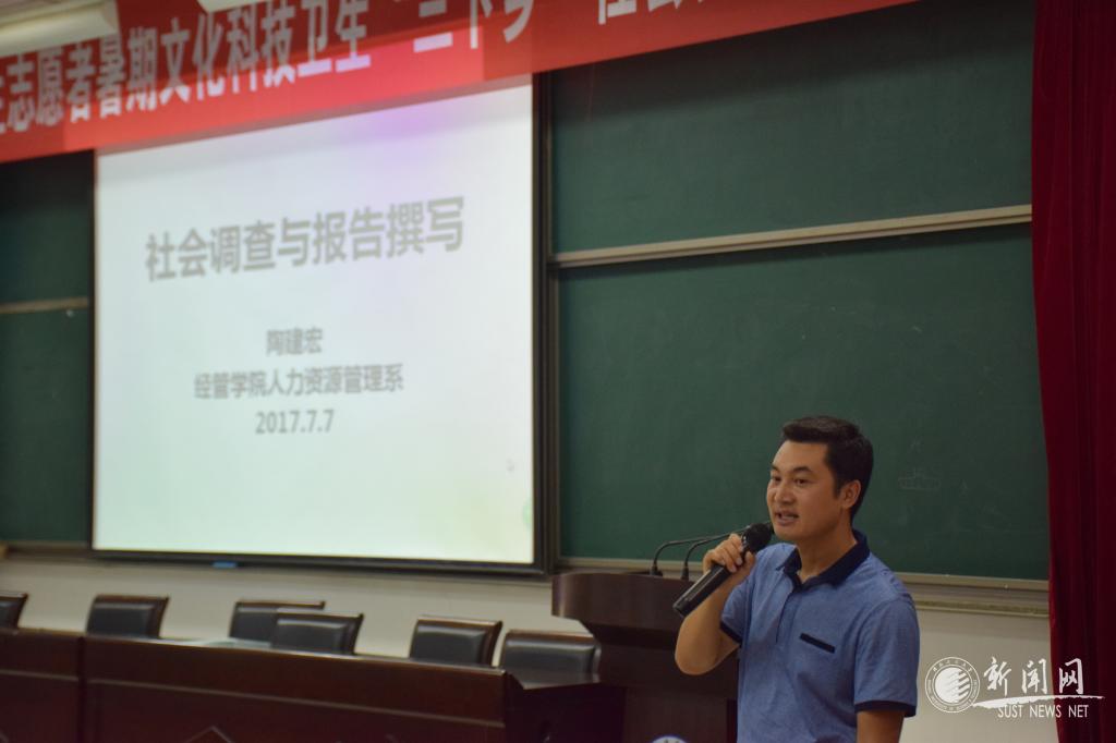 儀式后,經(jīng)濟(jì)與管理學(xué)院副教授陶建宏應(yīng)邀為全體實(shí)踐團(tuán)隊(duì)成員作了題為《大學(xué)生暑期社會(huì)實(shí)踐調(diào)研技能及調(diào)研報(bào)告撰寫方法》的專題講座,向全體社會(huì)實(shí)踐隊(duì)成員和帶隊(duì)老師系統(tǒng)講授了科學(xué)調(diào)研方法及調(diào)研報(bào)告的規(guī)范與要求。