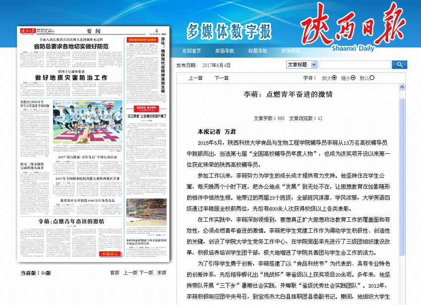 陜西日?qǐng)?bào)6月4日4版“要聞”以《李萌:點(diǎn)燃青年奮進(jìn)的激情》為題,報(bào)道我校優(yōu)秀輔導(dǎo)員李萌入選3月“中國(guó)好人榜”“敬業(yè)奉獻(xiàn)好人”的先進(jìn)事跡?!爸袊?guó)好人榜”評(píng)議活動(dòng)由中央文明辦主辦、中國(guó)文明網(wǎng)承辦。此前,李萌被評(píng)為陜西省2015年11-12月“陜西好人榜”“敬業(yè)奉獻(xiàn)類”“陜西好人”。