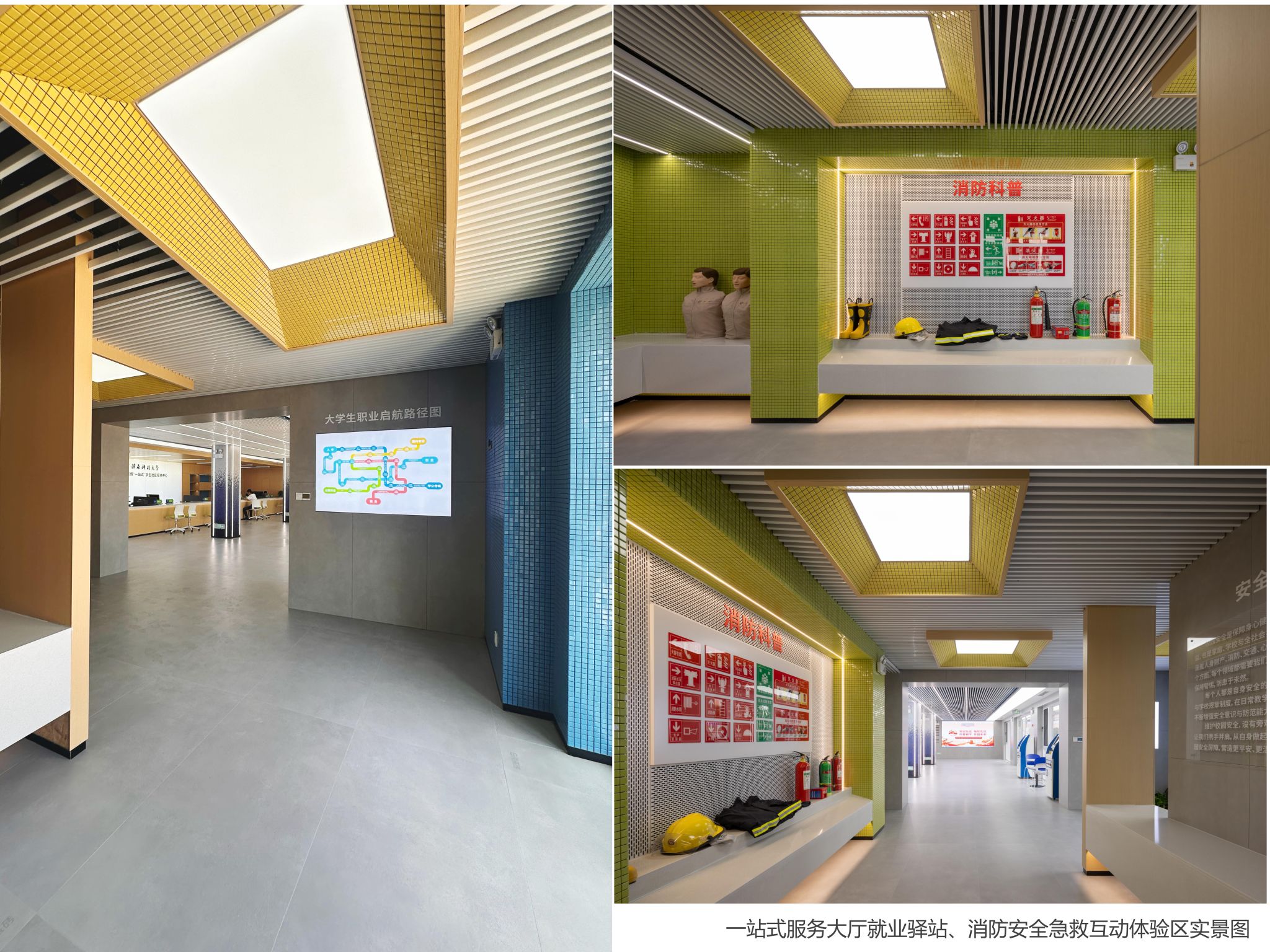 中心集中建設(shè)了面向?qū)W生的全方位服務(wù)平臺(tái),一樓服務(wù)大廳設(shè)有十余個(gè)服務(wù)窗口,在大量問需調(diào)研的基礎(chǔ)上,為學(xué)生提供教務(wù)、學(xué)工、財(cái)務(wù)、后勤、保衛(wèi)等各方面業(yè)務(wù)辦理及咨詢服務(wù),大廳還配備了自助服務(wù)一體機(jī)。大廳南側(cè)設(shè)置了就業(yè)驛站、消防安全及應(yīng)急救護(hù)互動(dòng)體驗(yàn)區(qū)、共享會(huì)議室。就業(yè)驛站集中展示職業(yè)生涯規(guī)劃導(dǎo)航知識(shí),及時(shí)更新推送就業(yè)信息和各地人才政策,并常態(tài)化接待學(xué)生提供專業(yè)精準(zhǔn)的生涯規(guī)劃及就業(yè)指導(dǎo)服務(wù);消防安全及應(yīng)急救護(hù)互動(dòng)體驗(yàn)區(qū)展示應(yīng)急救護(hù)、火災(zāi)防范等安全知識(shí),并結(jié)合全國(guó)防災(zāi)減災(zāi)日主題不斷更新展陳內(nèi)容,未來還將設(shè)置互動(dòng)體驗(yàn)設(shè)備,持續(xù)引導(dǎo)和服務(wù)廣大學(xué)生"人人講安全,個(gè)個(gè)會(huì)應(yīng)急"并積極查找和化解身邊安全隱患;共享會(huì)議室既能用于日?!敖釉V即辦”的接待,又能為師生提供共享式的面對(duì)面交流舒適空間。