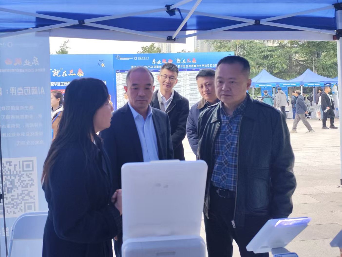 李學(xué)軍同大力支持本次活動的陜西省人才交流服務(wù)中心相關(guān)負(fù)責(zé)人一同走訪招聘活動現(xiàn)場,詳細(xì)了解了數(shù)智就業(yè)專區(qū)、就業(yè)指導(dǎo)專區(qū)的運(yùn)行情況、觀看了視頻直播帶崗的互動情況,與浙江嘉善縣組團(tuán)招聘專區(qū)負(fù)責(zé)人進(jìn)行了深入交談,詳細(xì)了解了崗位需求和政策待遇等情況?;顒悠陂g,李學(xué)軍一行還專程前往學(xué)生一站式社區(qū),實地調(diào)研就業(yè)驛站建設(shè)相關(guān)情況。