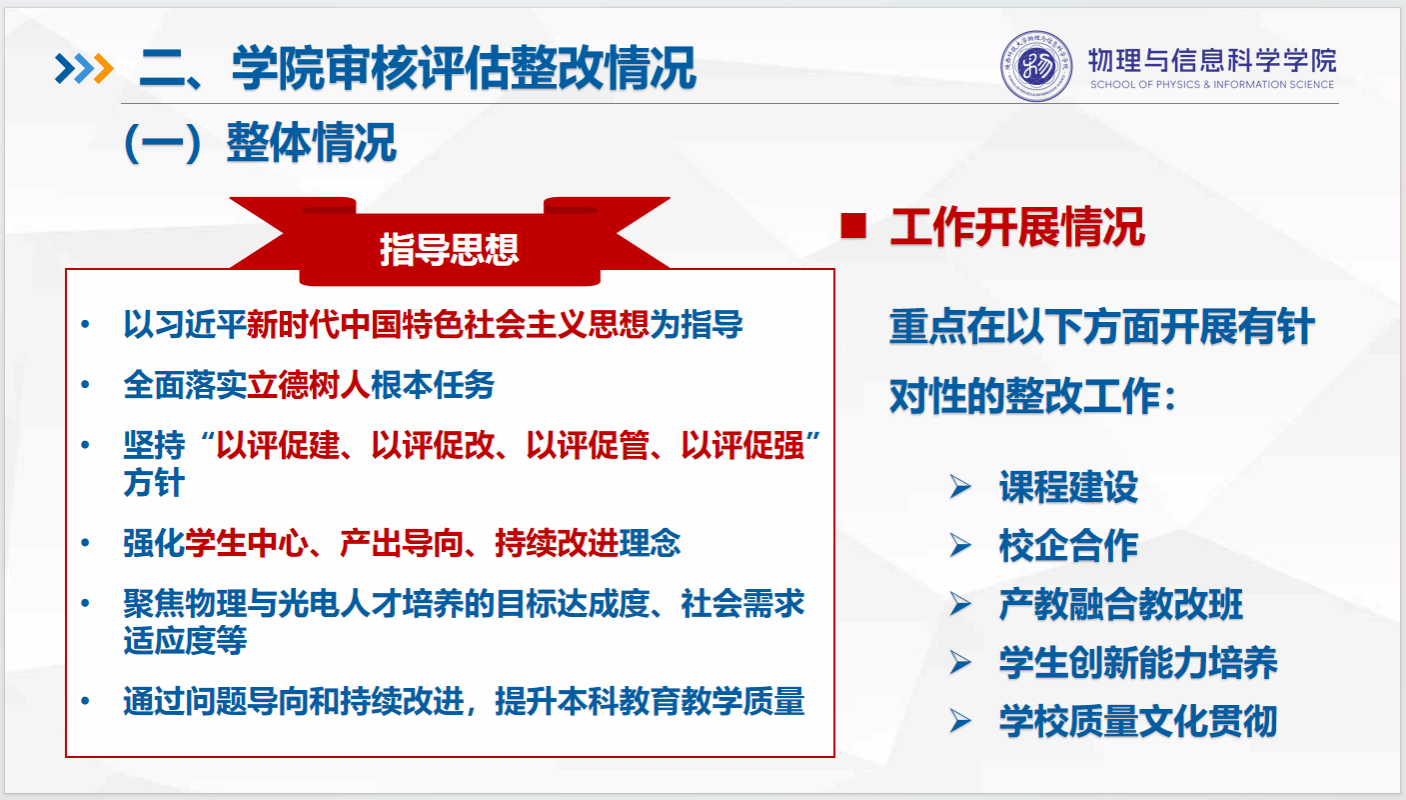 物理學(xué)院 劉建科:要做好本科教育教學(xué)審核評估整改工作,就必須了解審核評估。第一,審核評估關(guān)鍵原則有三個維度:堅持立德樹人根本任務(wù)。把育人成效作為檢驗(yàn)一切工作的標(biāo)準(zhǔn),確保教育方向正確;實(shí)施分類指導(dǎo)。國家按照高校定位定制評估方案,避免不同高校一刀切;強(qiáng)化問題導(dǎo)向,通過建立問題清單和督導(dǎo)復(fù)查,推動高校持續(xù)改進(jìn)質(zhì)量保障體系。第二,審核評估聚焦檢驗(yàn)學(xué)校自己設(shè)定的目標(biāo)是否達(dá)成和人才培養(yǎng)質(zhì)量,即人才培養(yǎng)目標(biāo)達(dá)成度、社會需求適應(yīng)度、師資條件保障度、質(zhì)量保障運(yùn)行有效度、學(xué)生和用人單位滿意度。只有真正了解其內(nèi)涵和要求,并認(rèn)真對待,就一定能達(dá)到以評促建,以評促改,以評促管,以評促強(qiáng)的目的。