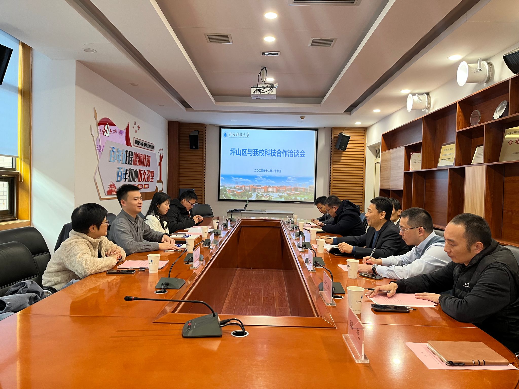 為深入實施服務社會創(chuàng)優(yōu)行動,促進產(chǎn)學研開放合作。12月27日上午,深圳市坪山區(qū)科技創(chuàng)新局副局長高坦一行3人來我校洽談科技合作。我校(深圳)技術轉移中心負責人趙星翼,輕工科學與工程學院、電子信息與人工智能學院、食品科學與工程學院相關人員參加座談。會議由前沿科學與技術轉移研究院副院長張鵬偉主持。