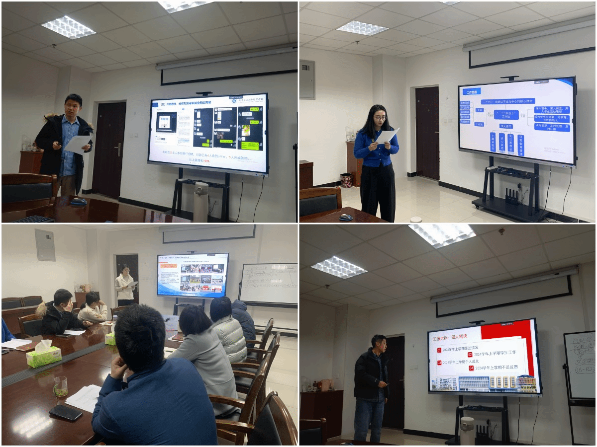 會(huì)上,學(xué)院全體輔導(dǎo)員對(duì)標(biāo)年初制定的工作計(jì)劃,匯報(bào)了一年以來(lái)思想政治教育、黨團(tuán)班建設(shè)、心理健康教育、就業(yè)指導(dǎo)、穩(wěn)定安全等方面工作的開(kāi)展情況,并對(duì)明年的工作進(jìn)行了規(guī)劃。研究生輔導(dǎo)員王蒙聚焦安全底線、政治引領(lǐng)、協(xié)同育人,引導(dǎo)學(xué)生自我教育、自我管理、自我服務(wù);2021級(jí)輔導(dǎo)員石杰鋒堅(jiān)持以學(xué)風(fēng)建設(shè)促進(jìn)考研、以求職指導(dǎo)助力就業(yè),全力服務(wù)學(xué)生高質(zhì)量就業(yè)升學(xué);2022級(jí)輔導(dǎo)員王凌波堅(jiān)持“一二三四五十”工作法,用心用情為學(xué)生辦實(shí)事、解難題;2023級(jí)輔導(dǎo)員劉戈妹堅(jiān)守“一個(gè)底線”,制定“兩大抓手”,依靠“三個(gè)法寶”,努力實(shí)現(xiàn)“五個(gè)育人”;2024級(jí)輔導(dǎo)員李浩東扎實(shí)開(kāi)展新生入學(xué)教育,在學(xué)風(fēng)建設(shè)、班團(tuán)建設(shè)等方面下硬功夫,幫助學(xué)生扣好人生第一粒扣子。