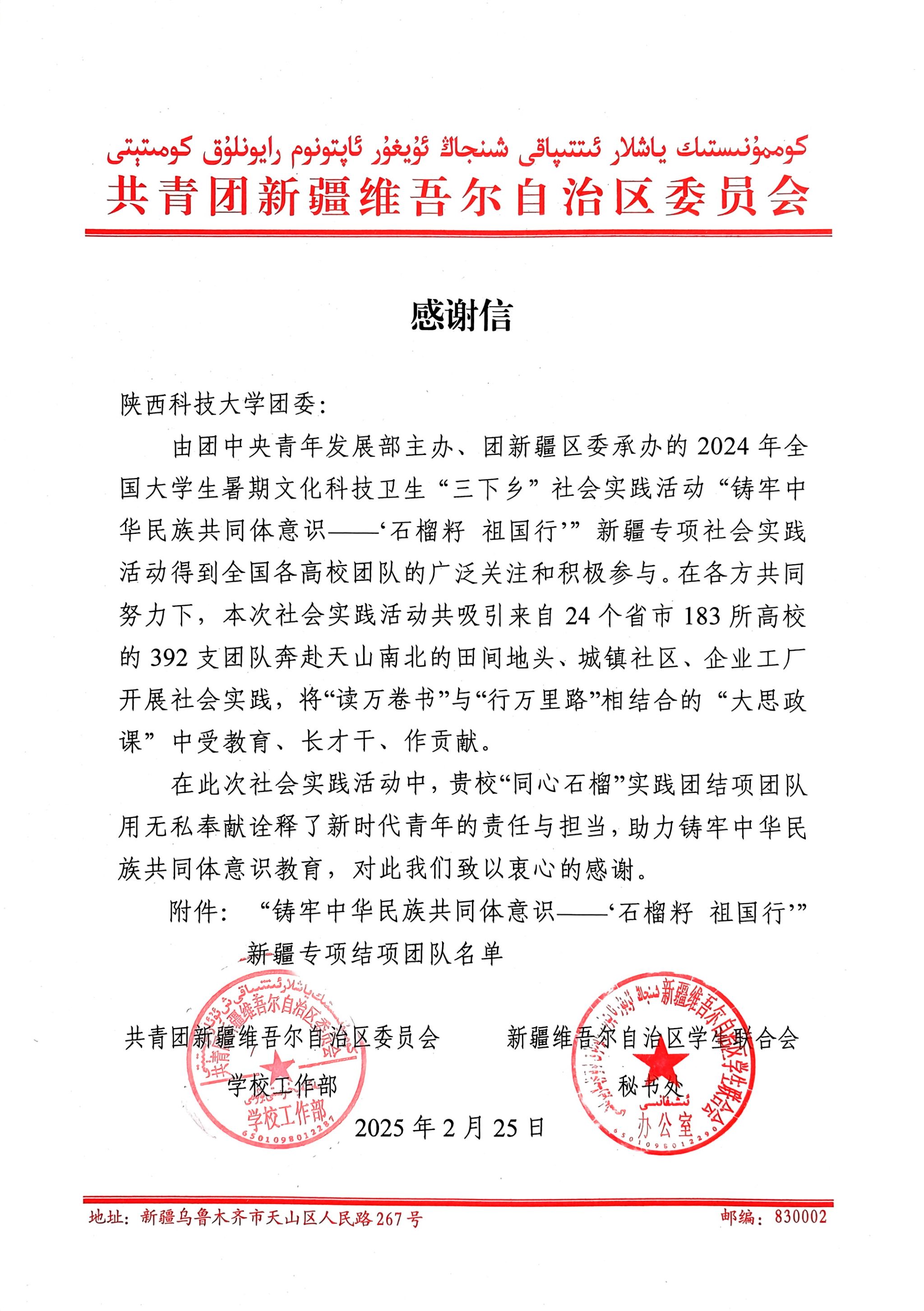 近日,共青團(tuán)新疆維吾爾自治區(qū)委員會(huì)向我校發(fā)來感謝信,對(duì)我校經(jīng)管學(xué)院“同心?石榴”實(shí)踐團(tuán)在“鑄牢中華民族共同體意識(shí)——‘石榴籽 祖國行’”新疆專項(xiàng)社會(huì)實(shí)踐活動(dòng)中的突出表現(xiàn)予以表揚(yáng)和感謝。