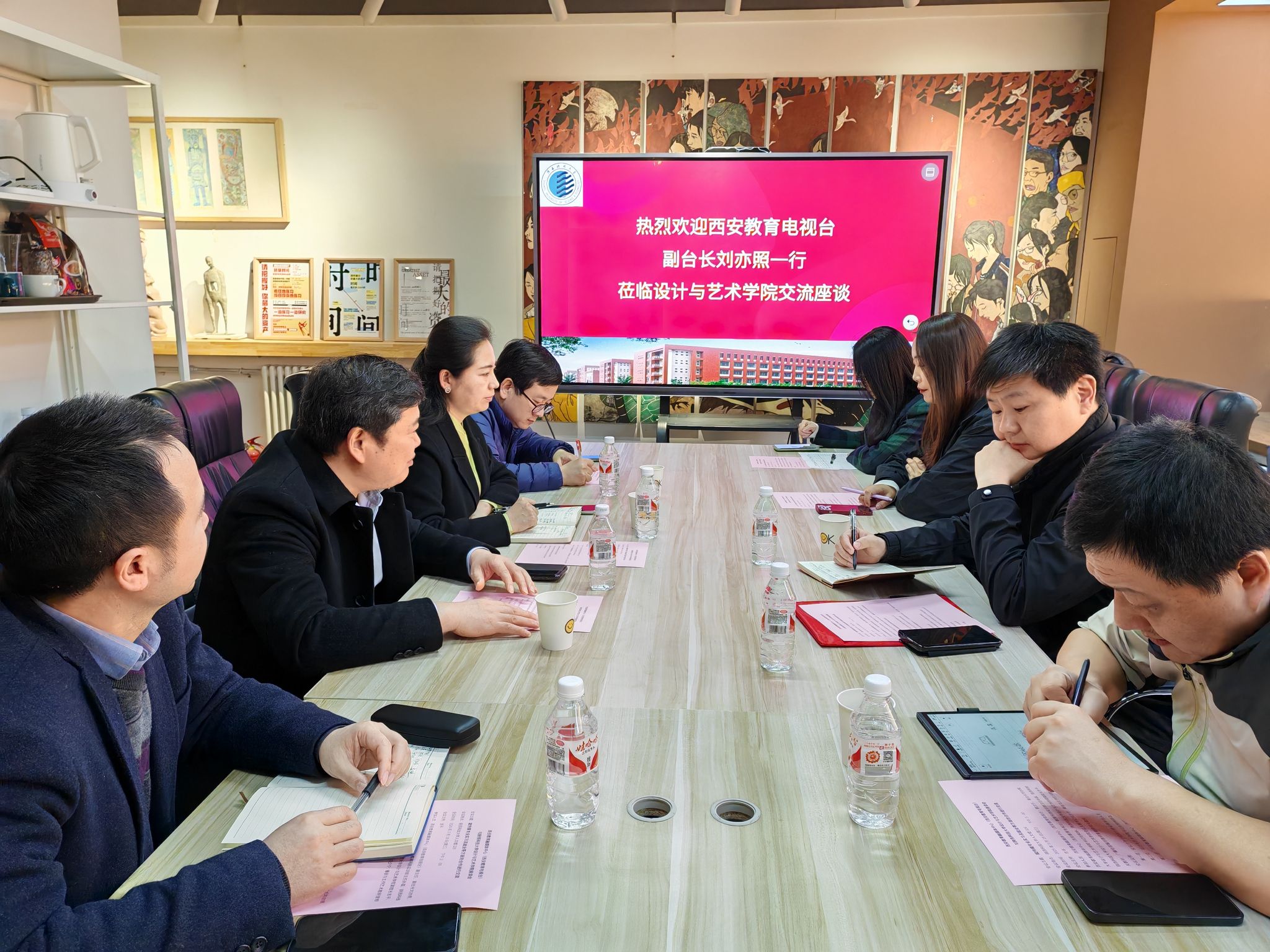 吉平首先介紹了與會(huì)的領(lǐng)導(dǎo)、嘉賓及相關(guān)教師,隨后劉和林介紹了學(xué)院近年來(lái)的學(xué)科發(fā)展情況,特別是對(duì)傳媒類(lèi)專(zhuān)業(yè)的發(fā)展做了詳細(xì)的介紹,劉亦照也介紹了西安教育電視臺(tái)近年來(lái)的發(fā)展情況,并對(duì)過(guò)去一年中與設(shè)藝學(xué)院傳媒類(lèi)專(zhuān)業(yè)的實(shí)習(xí)合作表示認(rèn)可,肯定了學(xué)院傳媒專(zhuān)業(yè)學(xué)生的培養(yǎng)質(zhì)量。田少寧緊接著介紹了播音與主持藝術(shù)、廣播電視編導(dǎo)、動(dòng)畫(huà)等多個(gè)與西安教育電視臺(tái)就業(yè)崗位相關(guān)的專(zhuān)業(yè)畢業(yè)生情況。劉亦照表示,希望通過(guò)此次座談和對(duì)設(shè)藝學(xué)院傳媒專(zhuān)業(yè)的進(jìn)一步了解,能夠吸納更多優(yōu)秀的畢業(yè)生來(lái)西安教育電視臺(tái)工作,為推進(jìn)媒體融合發(fā)展貢獻(xiàn)力量。