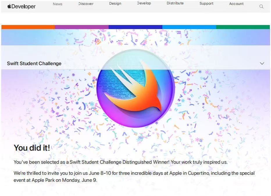 蘋果公司自2020 年開始舉辦Swift Student Challenge賽事,旨在支持和激勵(lì)新一代開發(fā)者、創(chuàng)作者和企業(yè)家。要求在 App Playground 中創(chuàng)建一個(gè)互動(dòng)式場景,并提供不超過三分鐘的體驗(yàn)。挑戰(zhàn)賽為學(xué)生開發(fā)者提供通過 App Playground 展現(xiàn)自身的創(chuàng)造力和編程能力的機(jī)會(huì),并從中學(xué)習(xí)到可以在職業(yè)生涯和更多地方運(yùn)用的實(shí)際技能。主辦方將選出 350 名 Swift Student Challenge 獲獎(jiǎng)?wù)撸员碚迷趧?chuàng)新思維、卓越創(chuàng)意、社會(huì)影響或多元包容等方面表現(xiàn)出色的優(yōu)秀作品。并最終從獲獎(jiǎng)?wù)咧羞M(jìn)一步選出 50 名杰出獲獎(jiǎng)?wù)撸⊿wift Student Challenge Distinguished Winner),并受邀參觀位于美國庫比提諾的 Apple 園區(qū)。