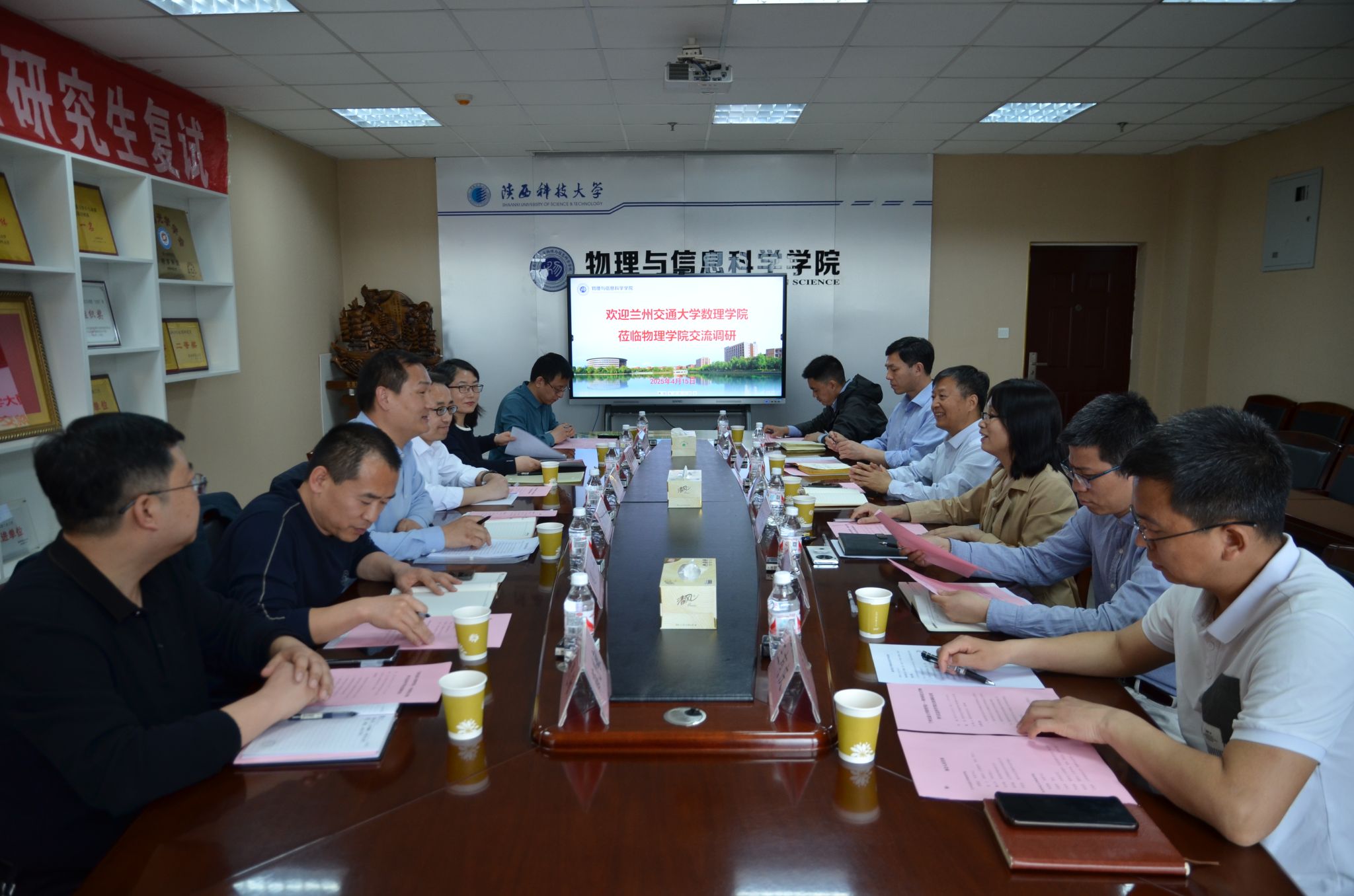 4月15日上午,蘭州交通大學(xué)數(shù)理學(xué)院黨委書記查鵬堂、副院長梁力、學(xué)科帶頭人魏小平等一行到訪我校,先后前往數(shù)學(xué)學(xué)院和物理學(xué)院開展調(diào)研交流活動。我校兩個學(xué)院黨政班子成員、相關(guān)系主任參加座談交流。