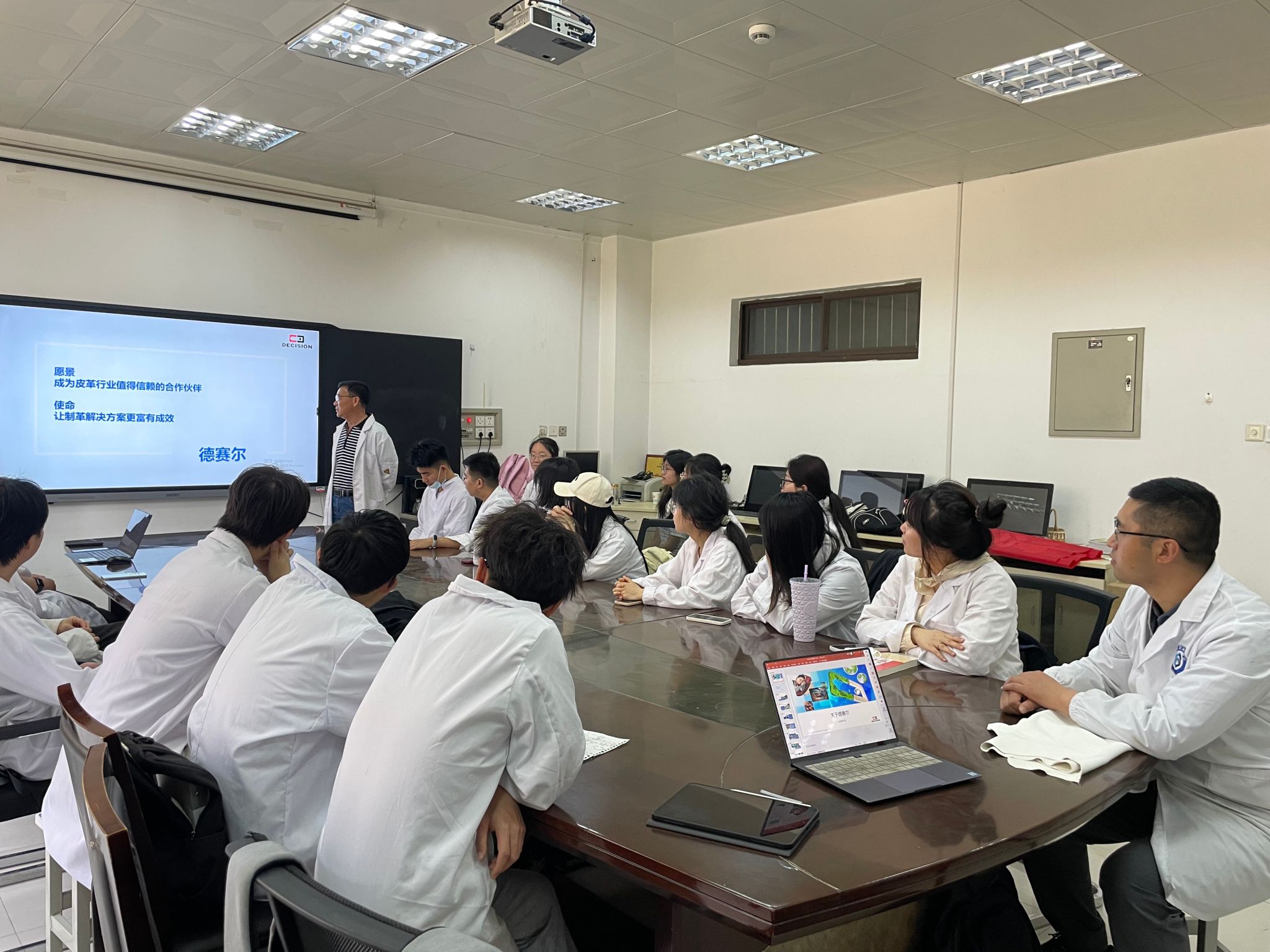 4 月 18-20 日,輕工科學(xué)與工程學(xué)院皮革系特邀四川德賽爾新材料科技有限公司開展技術(shù)交流與演示活動,該公司水場技術(shù)主管吳仲蓬經(jīng)理與校內(nèi)指導(dǎo)教師一起,指導(dǎo)了輕化工程專業(yè) 22 級學(xué)生的制革濕整飾實驗,并進行了無鉻鞣技術(shù)交流與演示活動。此次活動讓學(xué)院師生深入了解了制革的前沿技術(shù),同時也 拓展了專業(yè)視野。 在專題講座環(huán)節(jié),吳仲蓬經(jīng)理以《德賽爾DWT/CFW無鉻鞣體系》為題, 介紹了四川德賽爾新材料科技有限公司的基本概況和該公司 DWT/CFW 無鉻鞣體系的技術(shù)特點。通過豐富、詳實的講解,讓師生們?nèi)媪私饬四壳笆袌鲋髁鳠o鉻鞣技術(shù)的特點、應(yīng)用領(lǐng)域和發(fā)展趨勢。