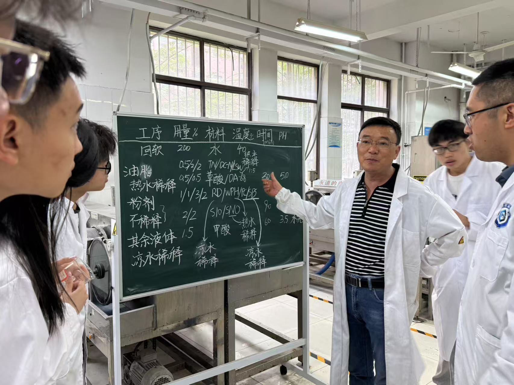 在實驗教學(xué)環(huán)節(jié),吳經(jīng)理和指導(dǎo)教師一起指導(dǎo)學(xué)生開展了綿羊皮服裝革無鉻鞣工藝實驗。實驗開始前,指導(dǎo)老師向?qū)W生們講解所使用濕整飾工藝中各類 化料的作用原理、控制要點、操作方法和注意事項。實驗過程中,專業(yè)師生一起進行了回軟、復(fù)鞣、水洗、加脂和套色等一系列濕整飾實驗。為了讓學(xué)生們更直觀地感受不同材料的特性,采用分組試驗對比的實驗方式,讓學(xué)生們深度了解鈦白粉、黃色染料等不同材料的應(yīng)用效果差異。