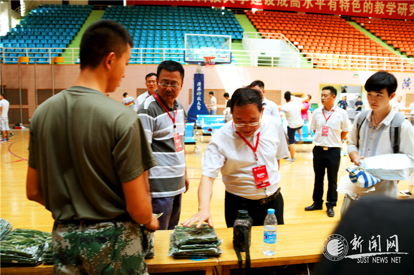 校領(lǐng)導(dǎo)一行在文體館察看新生軍訓(xùn)服裝發(fā)放工作