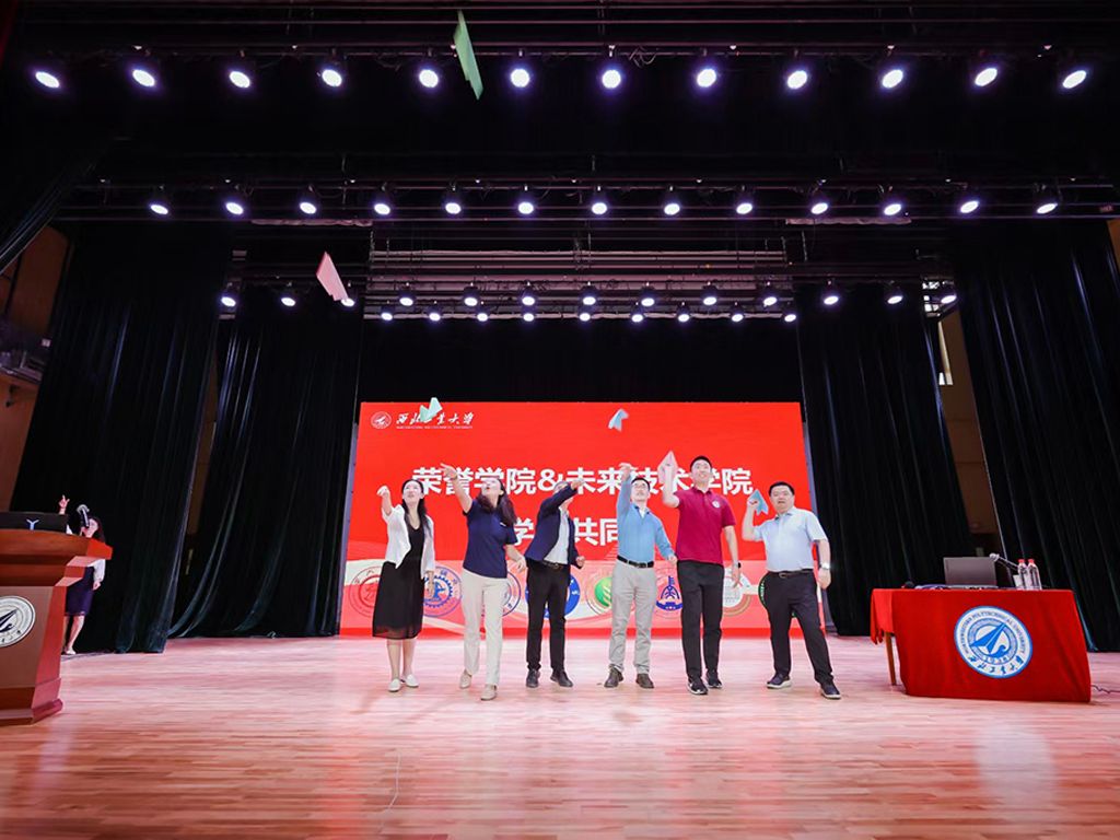 我校未來技術(shù)學(xué)院柔電本博貫通班班主任王元明老師與西北工業(yè)大學(xué)林鑫、牟蕾及兄弟高校榮譽(yù)學(xué)院、未來技術(shù)學(xué)院的領(lǐng)導(dǎo)們共同放飛紙飛機(jī),宣布本屆學(xué)生節(jié)開幕,共筑學(xué)習(xí)共同體、助力拔尖人才成長。