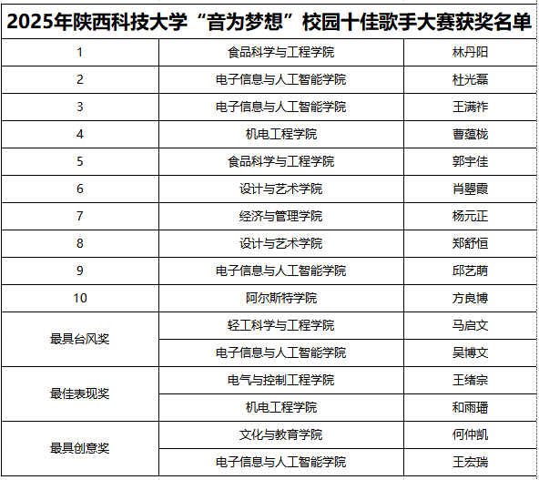 本次“音為夢想”校園十佳歌手大賽自5月啟動以來,吸引了全校200余名學(xué)生踴躍報名參賽,經(jīng)過學(xué)院推薦、大眾海選、復(fù)賽三個階段的激烈角逐,最終25名選手脫穎而出進入決賽。決賽當(dāng)晚,現(xiàn)場氣氛熱烈,觀眾熱情高漲,25名選手依次登臺獻唱,用歌聲詮釋青春夢想,展現(xiàn)科大學(xué)子的青春活力與藝術(shù)才華。決賽邀請西安交響樂團合唱團青年女高音演員脫凡、我省旅俄女中音歌唱家馬樂、寧夏師范大學(xué)聲樂教師徐學(xué)問、西安理工大學(xué)校團委馬青擔(dān)任評委。