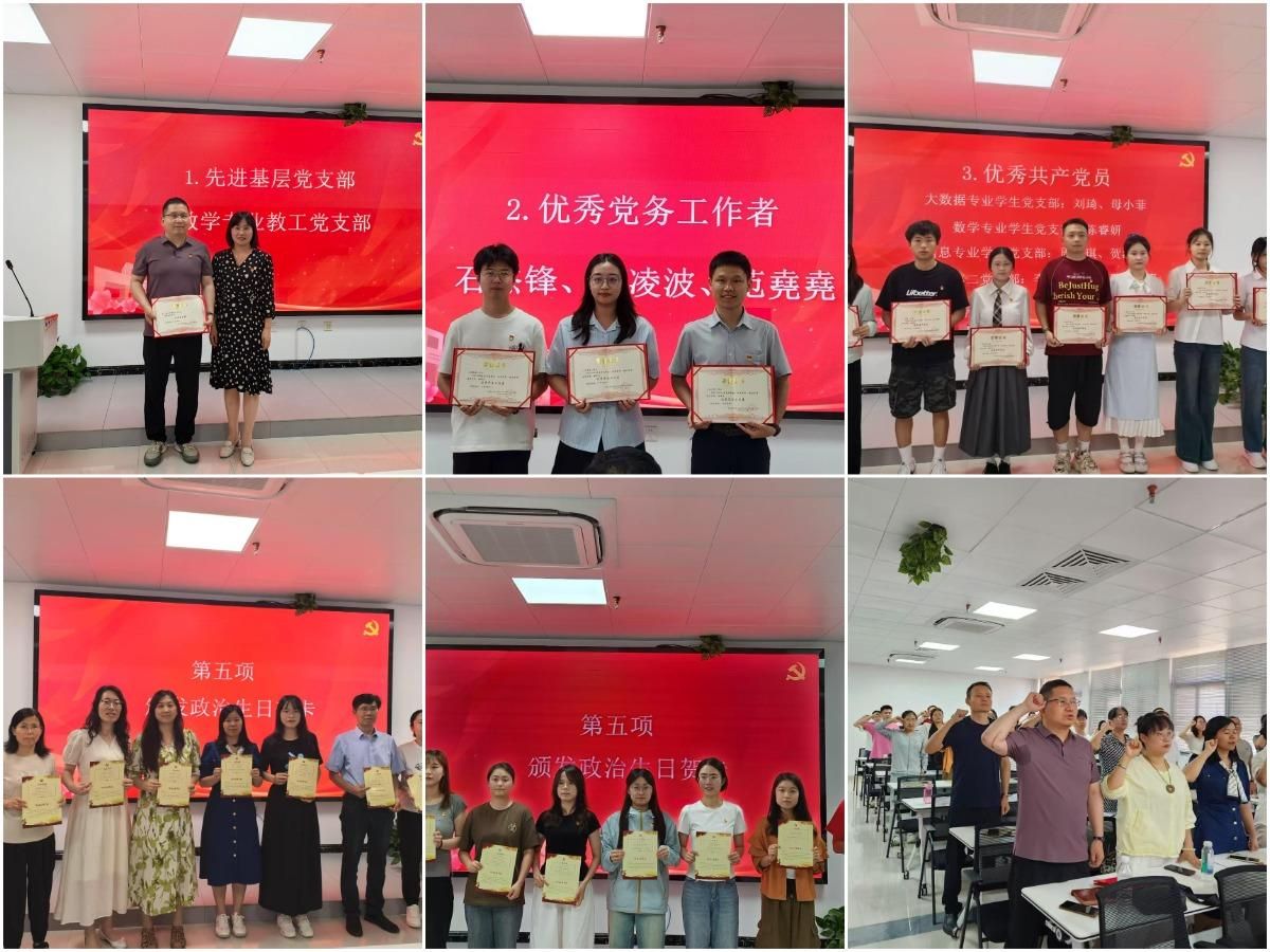 為慶祝中國共產(chǎn)黨成立104周年,表彰先進(jìn)、弘揚(yáng)正氣,激勵(lì)廣大黨員踔厲奮發(fā)、勇毅前行,數(shù)學(xué)與數(shù)據(jù)科學(xué)學(xué)院黨委于6月27日下午在教四A407報(bào)告廳舉行慶祝中國共產(chǎn)黨成立104周年暨“七一”表彰大會(huì)。數(shù)學(xué)學(xué)院全體師生黨員參會(huì),會(huì)議由學(xué)院黨委副書記宋沛主持。