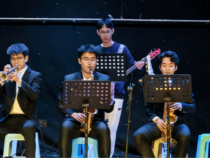 演出現(xiàn)場,古箏的悠揚(yáng)、竹笛的清脆與電聲樂器的激昂交織碰撞。民樂協(xié)奏曲《寄明月》以悠揚(yáng)旋律,引發(fā)在場觀眾共鳴;管樂協(xié)奏曲《鋼鐵洪流進(jìn)行曲》氣勢恢宏,喚起同學(xué)們內(nèi)心力量。2024年被“中國青年報(bào)”轉(zhuǎn)載的曲目《云宮迅音》再次演繹,傳統(tǒng)民樂與現(xiàn)代電聲器樂的融合,讓現(xiàn)場觀眾沉浸式感受民族音樂與現(xiàn)代音樂碰撞的獨(dú)特魅力;演出尾聲,全體同學(xué)共同演奏《送別》,熟悉的旋律引發(fā)全場大合唱,將活動(dòng)推向高潮。