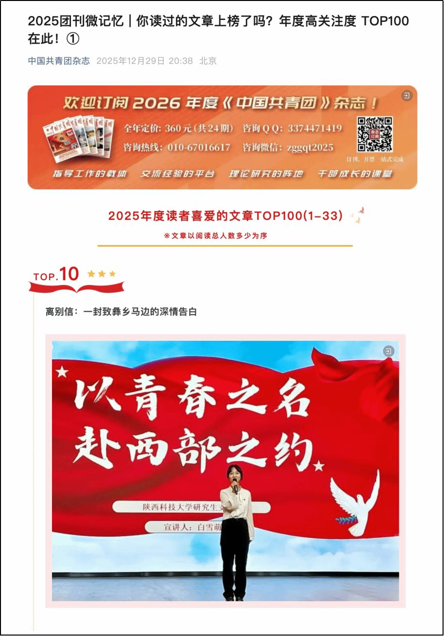 近日,《中國共青團雜志》微信公眾號發(fā)布2025年度讀者喜愛的文章TOP100榜單,由我校第26屆研究生支教團全體成員撰寫的《離別信:一封致彝鄉(xiāng)馬邊的深情告白》一文,入選該雜志“2025年度讀者喜愛的文章TOP10”。