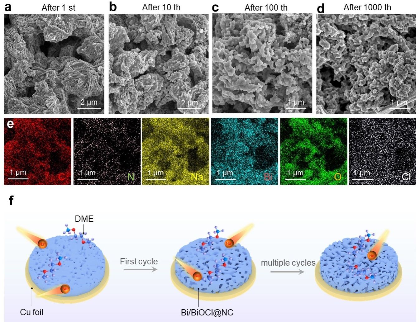 由于原料儲(chǔ)量豐富且成本低廉,鈉離子電池受到了前所未有的關(guān)注。然而,由于缺乏具有快速充電能力和極高穩(wěn)定性的替代負(fù)極材料,鈉離子電池的廣泛應(yīng)用受到了阻礙。為了應(yīng)對(duì)這一挑戰(zhàn),本論文開發(fā)了一種能夠快速充電的鈉離子電池負(fù)極材料,即嵌入氮摻雜碳框架的Bi/BiOCl(Bi/BiOCl@NC),該負(fù)極材料具有快速的Na+傳輸通道和超高的結(jié)構(gòu)穩(wěn)定性。在乙醚電解質(zhì)中循環(huán)時(shí),Bi/BiOCl@NC會(huì)發(fā)生顯著的結(jié)構(gòu)轉(zhuǎn)變,形成三維多孔骨架結(jié)構(gòu),這有利于增加Na+傳輸通道和縮減Na+傳輸距離,并能適應(yīng)充放電過程中的體積變化。通過密度泛函理論計(jì)算模擬Na+在該結(jié)構(gòu)中的儲(chǔ)存行為,發(fā)現(xiàn)Bi/BiOCl@NC具有較低的Na+傳輸勢(shì)壘(0.056 eV)和出色的電子導(dǎo)電性。獨(dú)特的結(jié)構(gòu)使得Bi/BiOCl@NC負(fù)極材料在20 A g–1條件下具有410 mAh g–1的超高Na+儲(chǔ)存能力,并能在10 A g–1的高電流密度條件下穩(wěn)定循環(huán)超過2300次,這一結(jié)果刷新了已報(bào)道的鈉離子電池負(fù)極材料的性能表現(xiàn)。這項(xiàng)工作為鈉離子電池提供了一種極具前景的負(fù)極材料,并將激勵(lì)研究人員開發(fā)出更多的新型儲(chǔ)能系統(tǒng)。