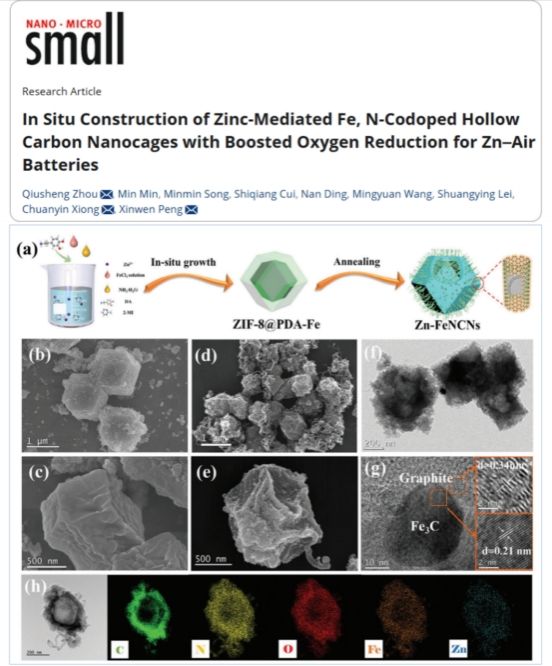 近日,本課題組周秋生副教授在設(shè)計高性能雙功能氧電催化劑并應(yīng)用于可充電鋅-空氣電池方面取得重要進展,相關(guān)成果以“In Situ construction of zinc-mediated Fe, N-codoped hollow carbon nanocages with boosted oxygen reduction for Zn air batteries”為題發(fā)表在Small期刊(文章鏈接:https://doi.org/10.1002/smll.202307943)。本文通過熱解表面聚合鐵摻雜聚多巴胺ZIF-8多面體,合成了鋅誘導的Fe, N共摻雜碳納米籠(Zn-FeNCNs)。理論計算和實驗結(jié)果均表明,多面體與聚多巴胺之間的強相互作用促進了高活性鋅調(diào)制的FeNx位點的演化和電子傳遞,從而提高了氧析反應(yīng)(OER)和氧還原反應(yīng)(ORR)的雙功能催化活性。此外,當將該催化劑應(yīng)用于固態(tài)電池時,該器件在不同彎曲角度下表現(xiàn)出優(yōu)異的機械穩(wěn)定性和較高的往返效率。