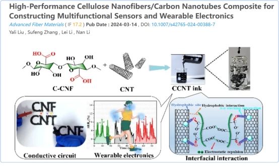 本課題組研究了一種由羧化纖維素納米纖維(C-CNFs)介導的水性碳納米管分散方法。利用CNFs的成膜特性和CCNT的面內(nèi)定向自組裝特性,制備出具有高導電性(67 S cm?1)和高力學性能(抗拉強度為153 MPa)的復(fù)合自支撐膜。此外,所得的生物基CCNT油墨與各種印刷工藝兼容,并適應(yīng)各種承印物。相關(guān)研究成果以“High-performance cellulose nanofibers/carbon nanotubes composite for constructing multifunctional sensors and wearable electronics”為題發(fā)表在國際期刊Advanced Fiber Materials(文章鏈接:https://doi.org/10.1007/s42765-024-00388-7)。