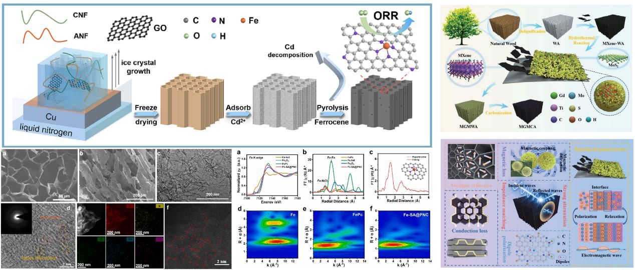 沈夢霞副教授課題組以木質(zhì)纖維等生物質(zhì)通過金屬交聯(lián)、活性物質(zhì)和熱犧牲金屬模板引入等策略,制備了一系列基于納米纖維素的氣凝膠體系,并通過對碳氣凝膠微結(jié)構(gòu)中金屬活性位點優(yōu)化篩選、孔結(jié)構(gòu)和碳質(zhì)缺陷等精細調(diào)控,構(gòu)建了系列碳載金屬單原子催化劑,實現(xiàn)了高性能鋅空氣電池應(yīng)用。相關(guān)研究成果發(fā)表在Energy Storage Materials, Chemical Engineering Journal, Journal of Colloid and Interface Science等期刊。此外,利用改性木材氣凝膠的定向多孔結(jié)構(gòu)負載具有高介電常數(shù)的MXene和磁性稀土氧化物Gd2O3,并結(jié)合MoS2納米片以形成多重異質(zhì)界面,制備了具有磁-介電協(xié)同和多層結(jié)構(gòu)的MoS2@Gd2O3/Mxene多孔碳氣凝膠復(fù)合材料,實現(xiàn)阻抗匹配和多重電磁波損耗機制,該木材衍生材料展現(xiàn)出優(yōu)異的電磁波吸收性能(Small 2024, 2306915)。其中有5篇論文入選ESI高被引論文,部分文章鏈接:https://doi.org/10.1016/j.ensm.2023.102790,https://doi.org/10.1002/smll.202306915,https://doi.org/10.1016/j.cej.2024.158551。