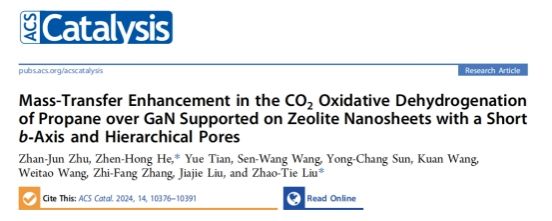 CO2氧化丙烷脫氫反應(yīng)(CO2-ODHP)不僅能生產(chǎn)大量丙烯,還能實現(xiàn)CO2減排和資源化回收,具有非常重要的意義。然而,該反應(yīng)在高溫條件下(>500 ℃)進(jìn)行,催化劑積碳是導(dǎo)致其失活的重要因素,也是高溫催化反應(yīng)中面臨的常見難題之一。圍繞該問題,課題組開發(fā)出具有微孔、中孔和大孔的片狀分子篩,并負(fù)載GaN制備出具有多級孔納米片結(jié)構(gòu)特征的GaN/HNS-1催化劑,能夠高效催化CO2-ODHP反應(yīng)進(jìn)行,同時能夠顯著降低失活速率。DFT理論計算和原位DRIFTS證實,該反應(yīng)涉及直接脫氫(DHP)和逆水煤氣變換反應(yīng)(RWGS),尤其是采用的多級孔片層分子篩催化劑能夠顯著增加氣體分子傳質(zhì)擴(kuò)散效率,促進(jìn)積碳前驅(qū)體的快速轉(zhuǎn)移,從而顯著提高催化性能。相關(guān)研究工作以“Mass-transfer enhancement in the CO2 oxidative dehydrogenation of propane over GaN supported on zeolite nanosheets with a short b-axis and hierarchical pores”為題發(fā)表在催化領(lǐng)域國際著名期刊ACS Catalysis(影響因子IF=11.7)上。我校碩士研究生朱占軍為第一作者,何珍紅教授和劉昭鐵教授為共同通訊作者,陜西科技大學(xué)為第一通訊單位,陜西師范大學(xué)為共同通訊單位。