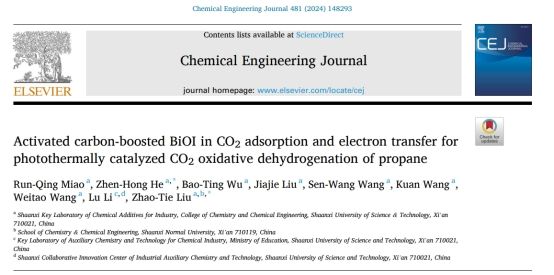 此外,為了降低CO2-ODHP反應(yīng)溫度,該團(tuán)隊開發(fā)出Pt-GaN/SrTiO3和BiOI/AC催化劑,利用光和熱的協(xié)同優(yōu)勢,在相對較低的溫度下(300 °C)實現(xiàn)該反應(yīng),首次報道了Pt-GaN/SrTiO3光熱催化CO2氧化丙烷脫氫反應(yīng),揭示出GaN和Pt分別為C-H和C=O的活化中心;同時表明CO2在光熱和熱的條件下有不同的轉(zhuǎn)化路徑;揭示了反應(yīng)機(jī)理是丙烷直接脫氫耦合逆水煤氣反應(yīng)。相關(guān)工作分別以“Photothermal catalytic CO2 oxidative dehydrogenation of propane over a dual functional Pt-GaN/SrTiO3 catalyst”和“Activated carbon-boosted BiOI in CO2 adsorption and electron transfer for photothermally catalyzed CO2 oxidative dehydrogenation of propane”為題在Applied Catalysis B: Environment and Energy(IF=20.3)和Chemical Engineering Journal(IF=13.4)期刊上發(fā)表。論文均以陜西科技大學(xué)為第一通訊單位,博士研究生王森望和碩士研究生苗潤青分別為論文的第一作者,何珍紅教授和劉昭鐵教授為通訊作者。