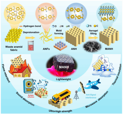 團(tuán)隊(duì)受ACS Applied Materials & Interfaces期刊邀稿,在“Functional Aerogels”專欄發(fā)表綜述,全面探討了不同維度ANF氣凝膠的制備、性能、應(yīng)用進(jìn)展、挑戰(zhàn)和前景。該文章首先總結(jié)了ANF分散液的流變特性,不同的制備策略,以及ANF氣凝膠的干燥方法。然后,評述了各種形態(tài)的ANF氣凝膠的獨(dú)特性質(zhì)以及基于這些性質(zhì)的突出優(yōu)勢,并對柔性保溫、環(huán)保、儲能等領(lǐng)域的多功能應(yīng)用進(jìn)展進(jìn)行了總結(jié)。最后,探討了ANF氣凝膠的主要挑戰(zhàn)和前景,為進(jìn)一步從實(shí)驗(yàn)室規(guī)模到工業(yè)規(guī)模的發(fā)展提供了見解。相關(guān)內(nèi)容以“Innovations Progress in Emerging Multifunctional Aramid Nanofiber Aerogels”為題目,發(fā)表在《ACS Applied Materials & Interfaces》上,碩士研究生王伊帆是第一作者,楊斌副教授、張美云教授為通訊作者。