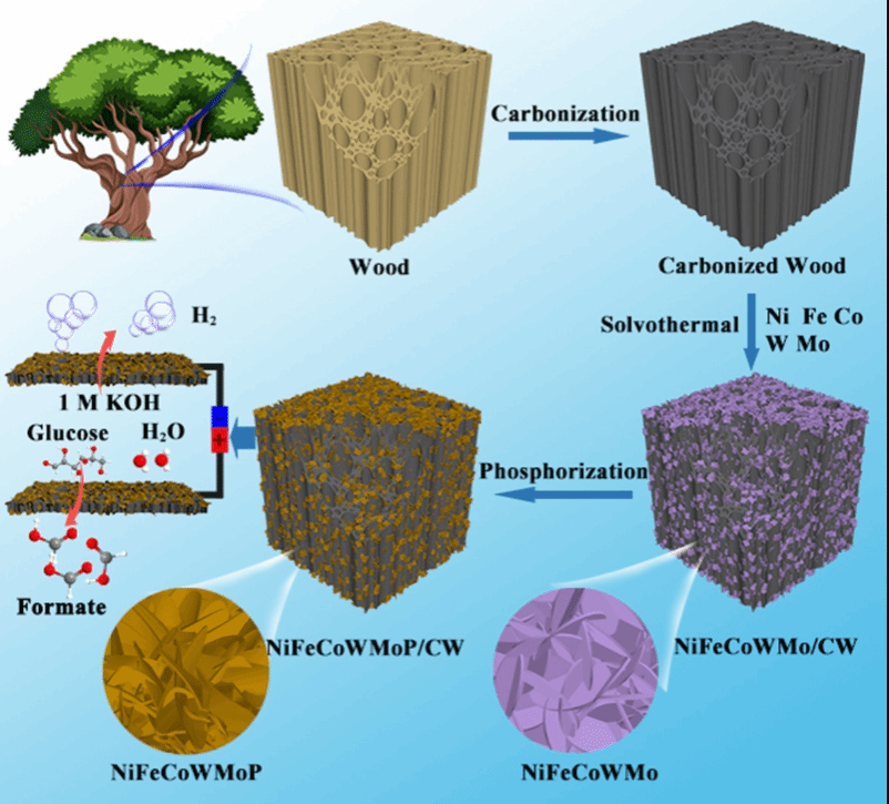 本團(tuán)隊(duì)通過溶劑熱和磷化物拓?fù)浞ㄔ诘颓实亩嗉壙紫短蓟静?CW)上生長出高熵磷化物納米片(NiFeCoWMoP),所制備的NiFeCoWMoP/CW用作集成碳電極,對析氫反應(yīng)(HER)和葡萄糖電催化轉(zhuǎn)化(GCR)均表現(xiàn)出顯著的雙功能特性。在堿性介質(zhì)中可以實(shí)現(xiàn)100 mA cm-2的高電流密度,并且在電解系統(tǒng)中可以在僅1.534 V的低電壓下實(shí)現(xiàn)100 mA cm-2的反應(yīng)電流,并產(chǎn)生氫氣。這項(xiàng)研究的結(jié)果強(qiáng)調(diào)了高熵磷化物納米片作為生物質(zhì)電催化轉(zhuǎn)化和制氫的多功能電催化劑的意義。相關(guān)研究成果以 “Harnessing biomass: High-entropy phosphide nanosheets-carbon hybrid electrocatalysts for efficient hydrogen production” 為題發(fā)表在國際期刊Journal of Materials Science & Technology (文章鏈接:https://doi.org/10.1016/j.jmst.2025.07.059)