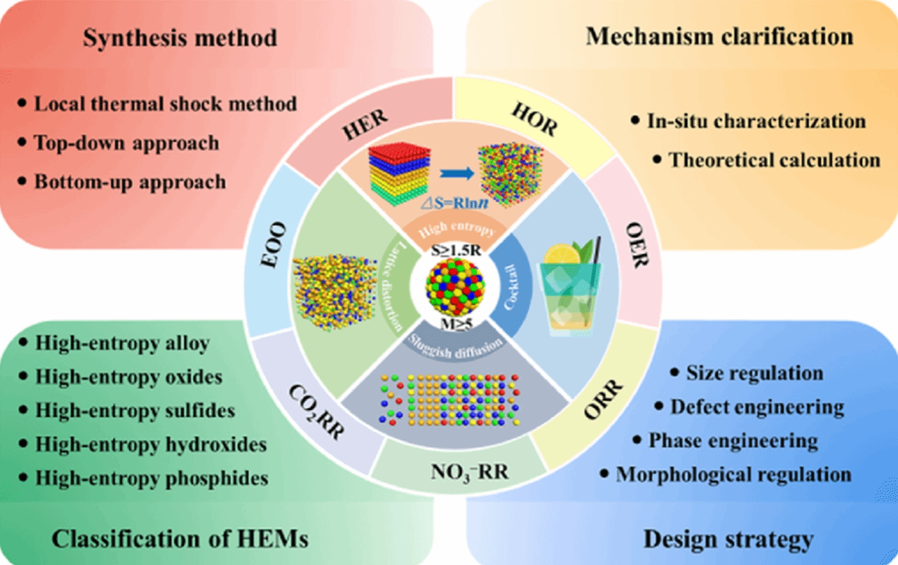 本團(tuán)隊(duì)系統(tǒng)闡述了高熵材料在電催化領(lǐng)域的最新進(jìn)展與未來前景。高熵材料憑借其多組分協(xié)同、高熵效應(yīng)和結(jié)構(gòu)可調(diào)等優(yōu)勢,正成為推動氫能制備、二氧化碳轉(zhuǎn)化、燃料電池等綠色能源技術(shù)發(fā)展的關(guān)鍵材料。本論文全面梳理了HEMS的分類、結(jié)構(gòu)構(gòu)建和調(diào)節(jié)策略,重點(diǎn)介紹了HEMS在電解水(HER、OER)、氫氧化(HOR)、氧還原(ORR)、二氧化碳還原(CO2RR)、硝酸鹽還原(NO3-RR)和有機(jī)物電氧化(EOO)等關(guān)鍵電催化反應(yīng)中的研究進(jìn)展。此外,還分析了HEMS的制備方法、催化過程中的結(jié)構(gòu)與性能關(guān)系以及熵調(diào)節(jié)機(jī)制。最后,本文提出了HEMS目前在電催化應(yīng)用方面面臨的關(guān)鍵挑戰(zhàn),并展望了其未來的發(fā)展方向,為構(gòu)建新一代高效、可持續(xù)的電催化劑提供理論基礎(chǔ)和設(shè)計思路。相關(guān)研究成果以 “Entropy-Driven Design of Multifunctional Electrocatalysts: Advances and Perspectives in High-Entropy Materials” 為題發(fā)表在國際期刊Green Energy & Environment (文章鏈接:https://doi.org/10.1016/j.gee.2025.10.007 )