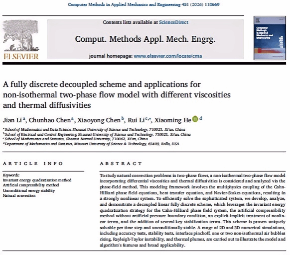 近日,數(shù)學(xué)與數(shù)據(jù)科學(xué)學(xué)院2024級碩士研究生陳春昊的科研成果“A fully discrete decoupled scheme and applications for non-isothermal two-phase flow model with different viscosities and thermal diffusivities”發(fā)表于計算力學(xué)三大刊之一Computer Methods in Applied Mechanics and Engineering上。該論文是在導(dǎo)師李劍教授和陜西師范大學(xué)李瑞副教授、美國密蘇里科技大學(xué)何曉明教授共同指導(dǎo)下完成的。這項工作為具有不同粘度和熱擴散率的非等溫兩相流模型的高效、解耦、線性、全離散數(shù)值格式的構(gòu)造提供了新的研究策略。該研究成果與李劍教授團隊今年在Journal of Computational Physics上發(fā)表的成果受到了同行的廣泛關(guān)注,先后受邀在中科院、同濟大學(xué)、南方科技大學(xué)、寧波東方理工大學(xué)等高校及中國數(shù)學(xué)會計算數(shù)學(xué)年會、中國工業(yè)與應(yīng)用數(shù)學(xué)學(xué)會年會研討論會上報告。